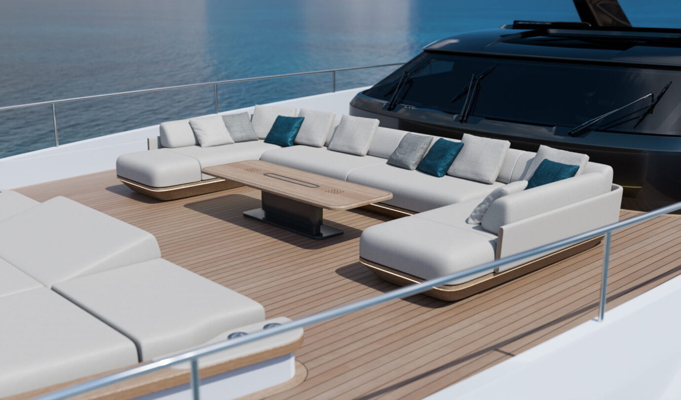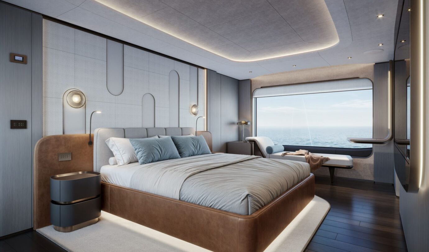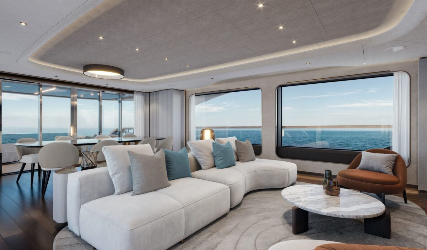 Gli interni, curati da Acube Design, esprimono un’estetica organica e sofisticata con linee morbide, materiali naturali e ambienti inondati di luce grazie alle ampie superfici vetrate. Sul main deck il salone principale è concepito per la massima flessibilità, mentre la suite armatoriale full-beam si distingue innanzitutto per la luminosità e la vista panoramica. Sono stati poi aggiunti dettagli raffinati come un ampio bagno en suite finestrato, una generosa armadiatura walk-in closet, un angolo beauty con specchio illuminato e un desk trasversale fruibile come tavolo colazione o home office. L’upper deck esteso offre ulteriori configurazioni personalizzabili e una Pilot House indipendente, mentre il lower deck ospita le quattro cabine ospiti e una zona equipaggio con 5 posti letto, con accessi separati e spazi funzionali.