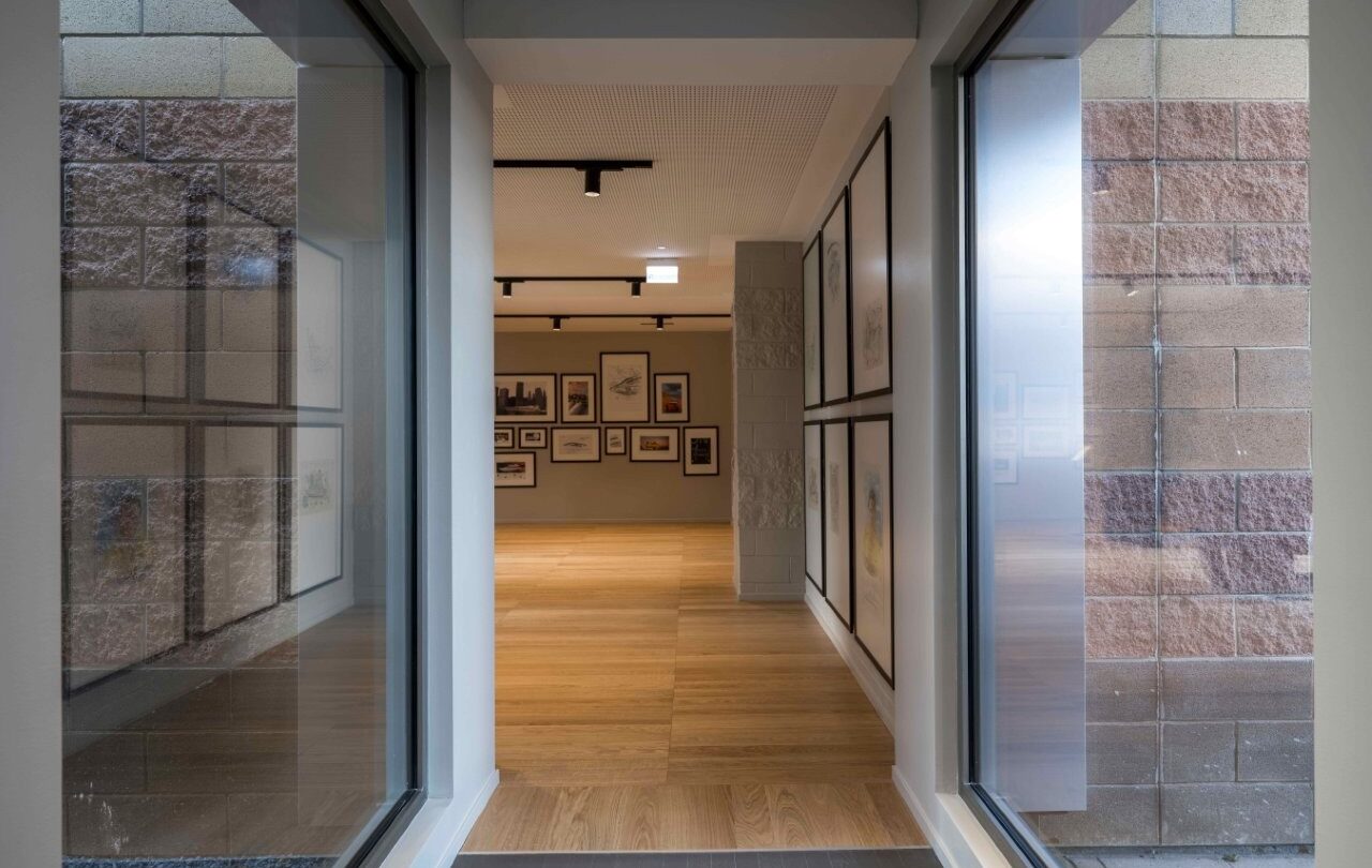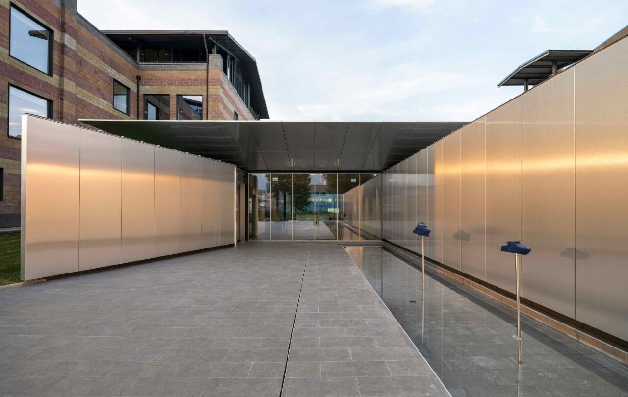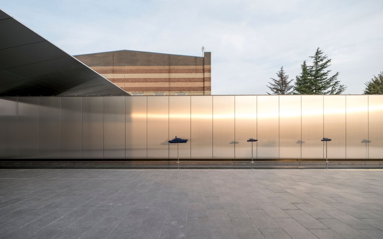 Il nuovo padiglione si presenta come il nuovo ingresso alla sede e racconta una poetica dei contrasti: un volume essenziale e metallico, che evoca il mondo nautico, si appoggia al corpo in mattoni dell’edificio storico. Le pareti continue rivestite in Alucobond riflettono la luce naturale, amplificando l’effetto materico della struttura esistente e armonizzando il dialogo tra memoria e contemporaneità. Il percorso verso l’ingresso è segnato poi da una vasca d’acqua lineare sul lato destro, dalla quale emergono modellini di barche sospesi sull’acqua, tributo alle principali innovazioni stilistiche e tecnologiche di Azimut, come l’introduzione nel 2003 delle vetrature a scafo al posto dei tradizionali oblò, una scelta visionaria che oggi riecheggia ad Avigliana grazie alle finestre trasformate in vetrate a tutta altezza, a sottolineare la continuità tra innovazione nautica e linguaggio progettuale.