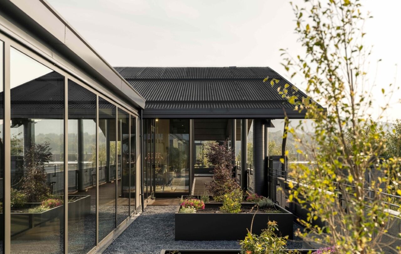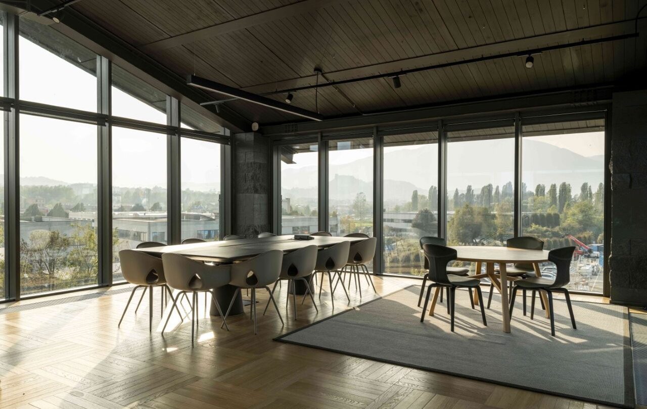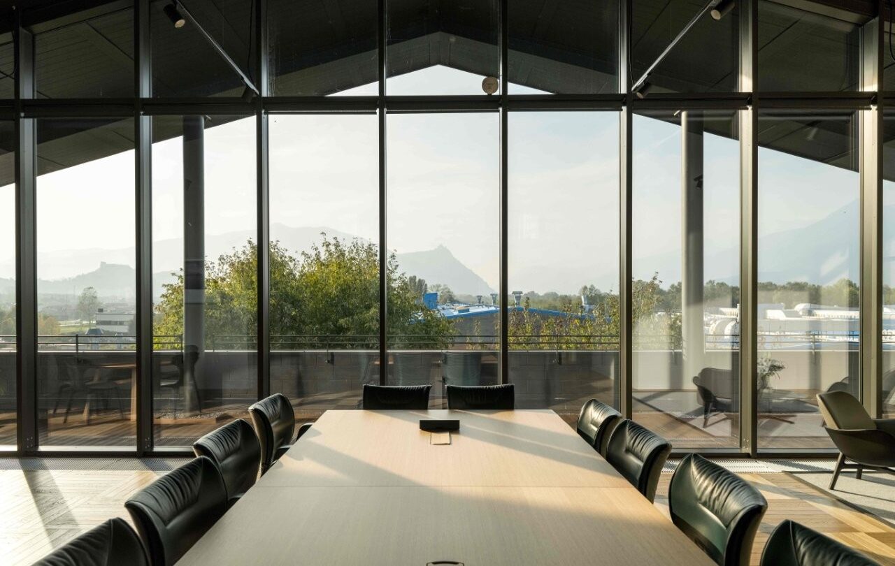 Dal padiglione si accede infine direttamente alla palazzina storica, completamente riqualificata. L’intervento ha interessato anche una porzione del piano terra, dove trovano posto le Sea Rocks, grandi oggetti scultorei che permettono di conoscere ed esplorare i materiali innovativi e le tecnologie d’avanguardia impiegate dal brand. Una parete è invece dedicata alla quadreria fotografica, che ripercorre i 50 anni dell’azienda attraverso una narrazione tematica. Il terzo piano accoglie la boardroom e le principali sale riunioni. I collegamenti tra i diversi ambienti si sviluppano attraverso una nuova passeggiata interna, che connette le tre torrette precedentemente distinte ed è caratterizzata da ampie vetrate continue e terrazze panoramiche.