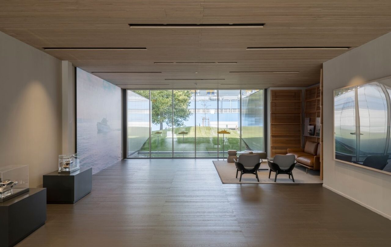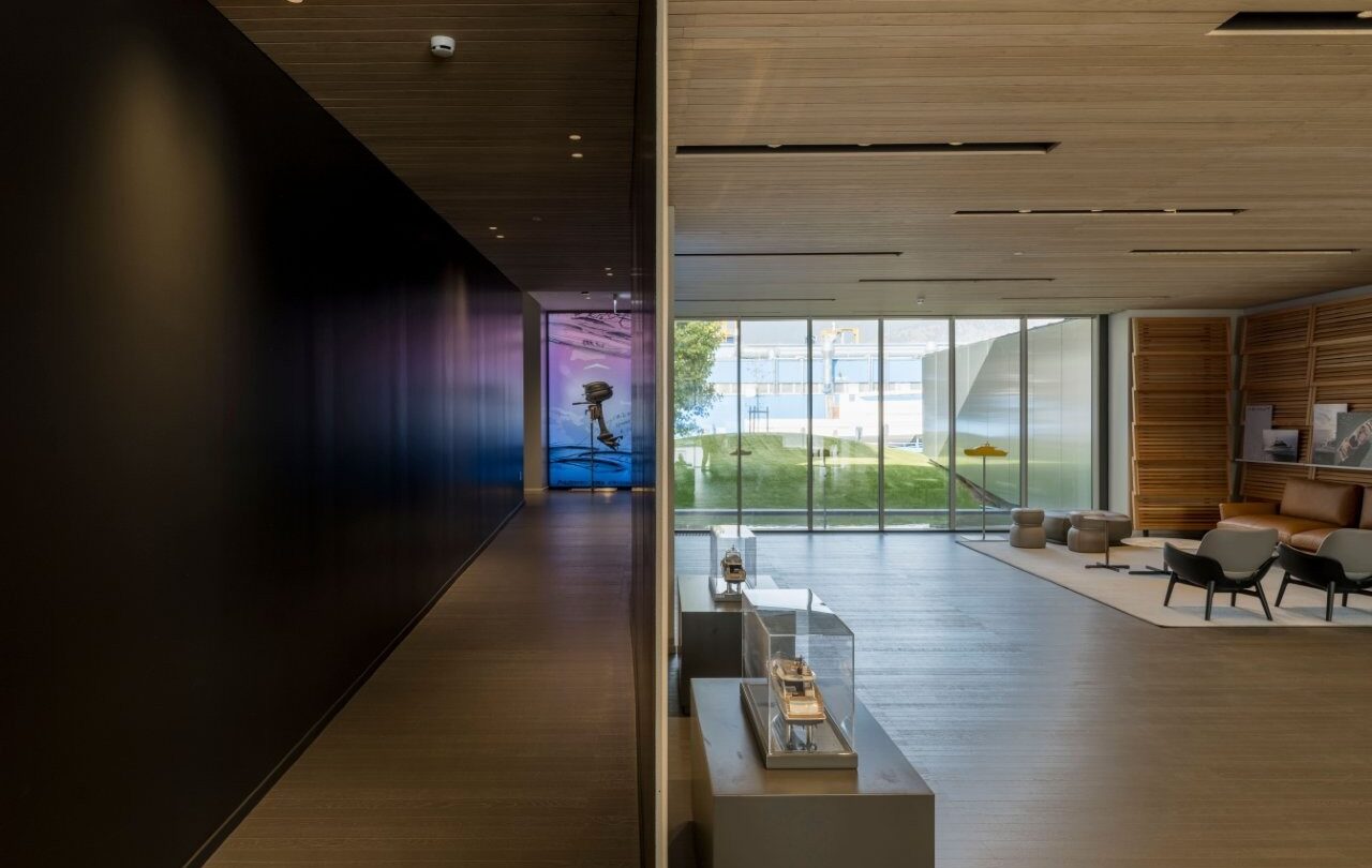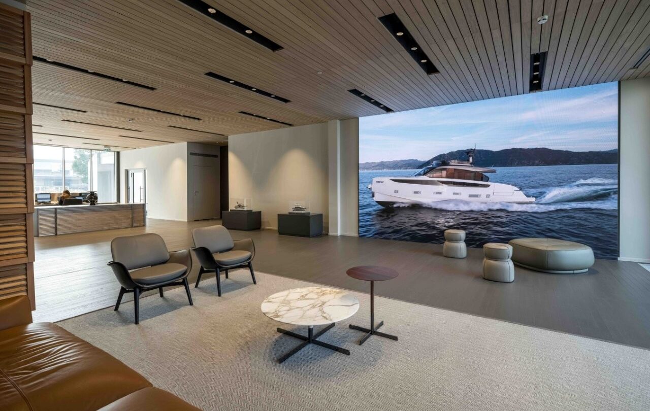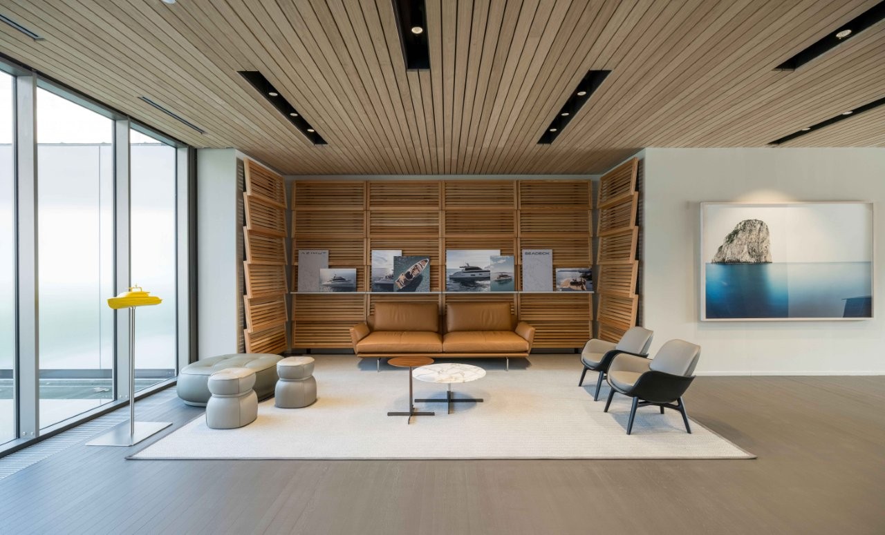 Una parete interamente vetrata caratterizza anche il varco d’ingresso, rivelando uno spazio luminoso e trasparente, definito da elementi in legno e alluminio. L’atmosfera è calda ed elegante: la reception introduce a una waiting lounge che riprende i codici visivi e materici già sviluppati per gli allestimenti temporanei di Azimut, rafforzando la coerenza identitaria del progetto. Un ledwall completa l’esperienza con un racconto visivo dinamico, fatto di contenuti in costante aggiornamento, capaci di restituire la visione presente e futura del brand integrandola in modo discreto nell’architettura.