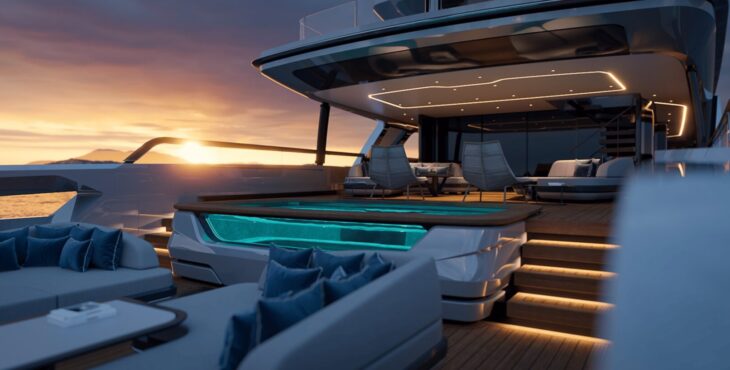 The sun deck, a distinctive element of all Baglietto yachts, has been further expanded, reaching an impressive 150m2 in surface area, as has the aft area, covering three interconnected levels, including a large lounge area surrounding a pool at water level. This new unit also allows for extensive personalisation in this area, including the option of integrating a collapsible lateral platform for the tender, a technical solution that highlights the shipyard’s skill in satisfying the specific needs of their clients providing them with bespoke and highly customisable products.