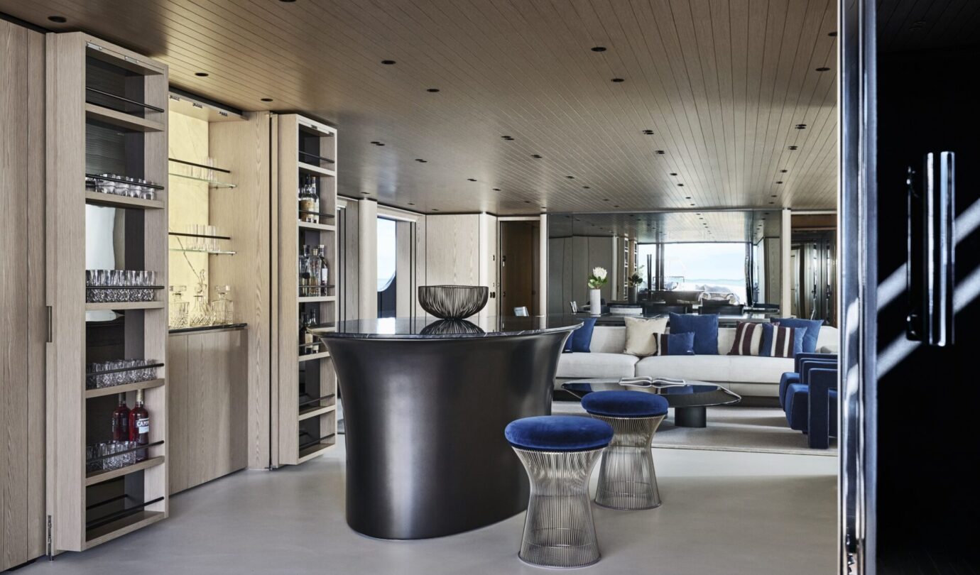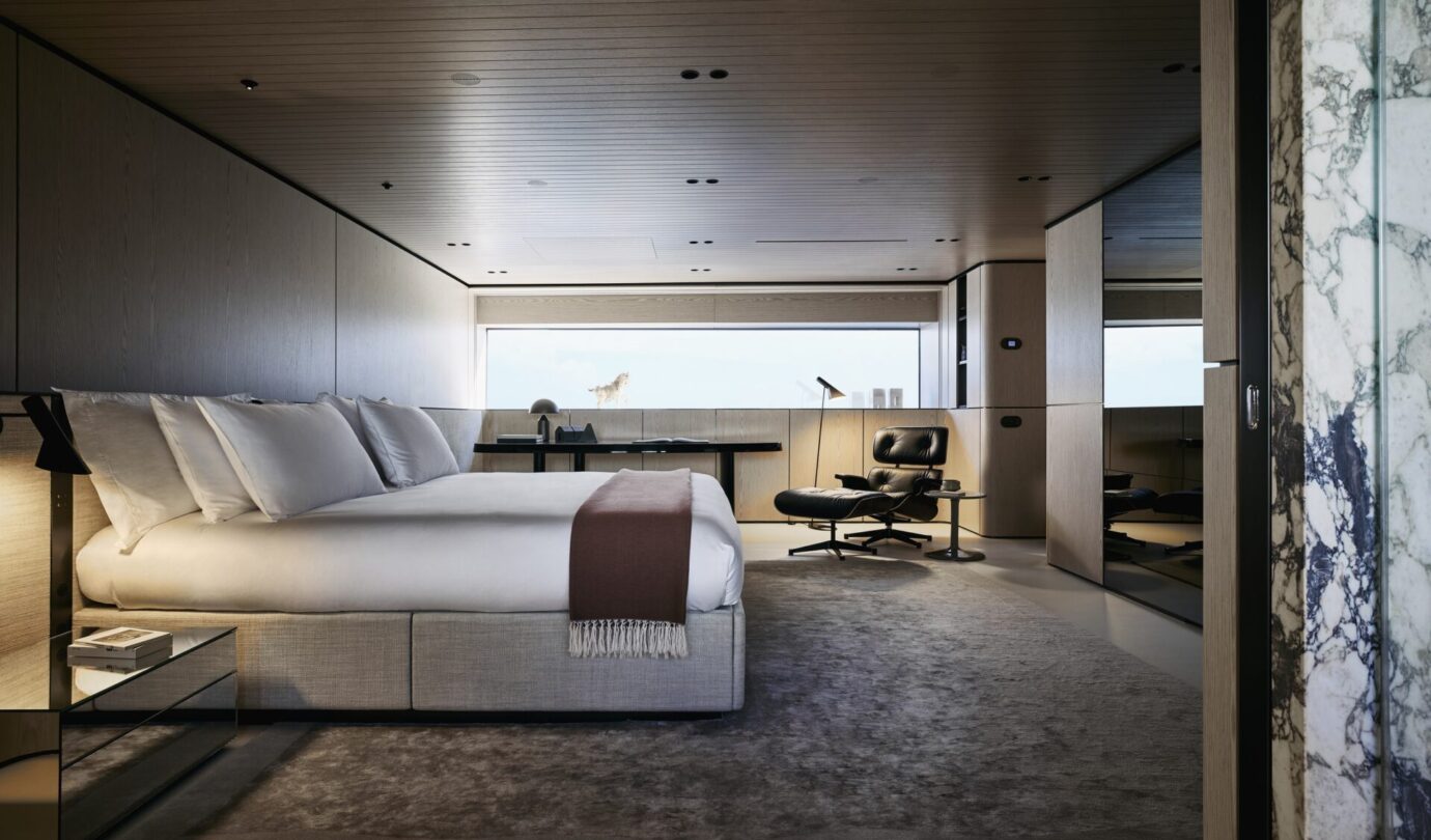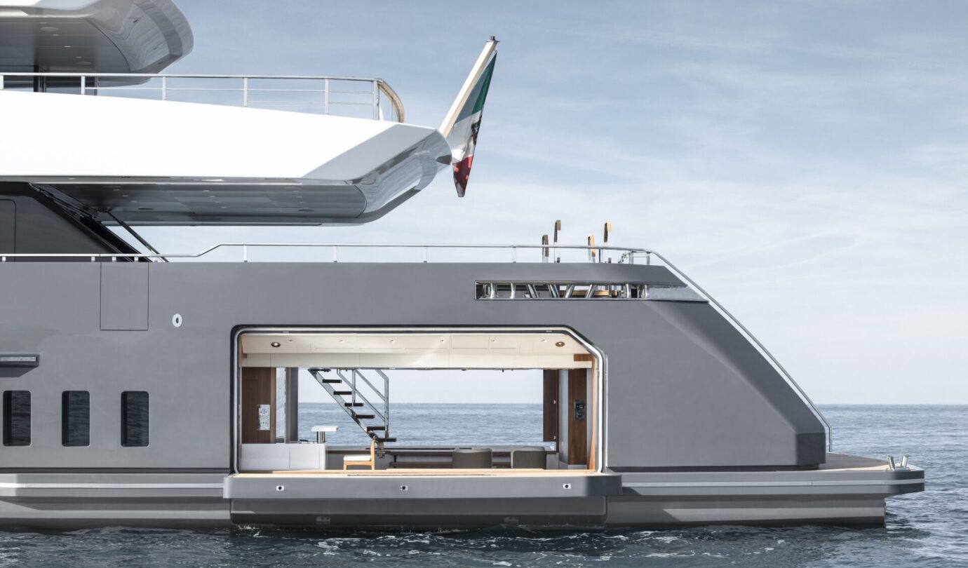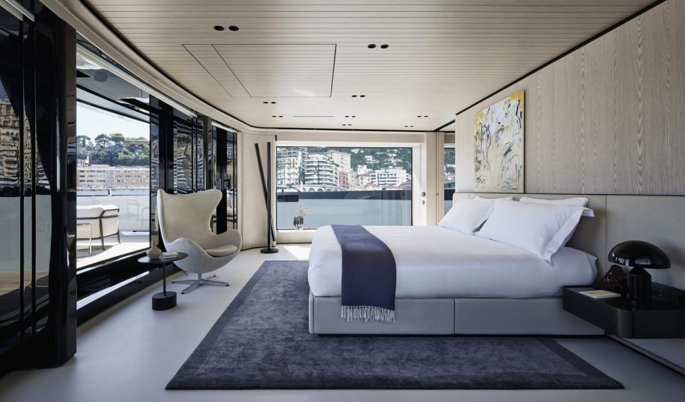 To the bow is a glass pool and an 85m2 flybridge, while to the stern is the beach club and the collapsible terraces create a large platform on the waterline, connecting the vessel to the water. The 55m2 owner’s suite is located to the bow, on the main deck, and the lateral garage for the transversal launch of tenders guarantees that functionality will not impair the formal elegance of the yacht.