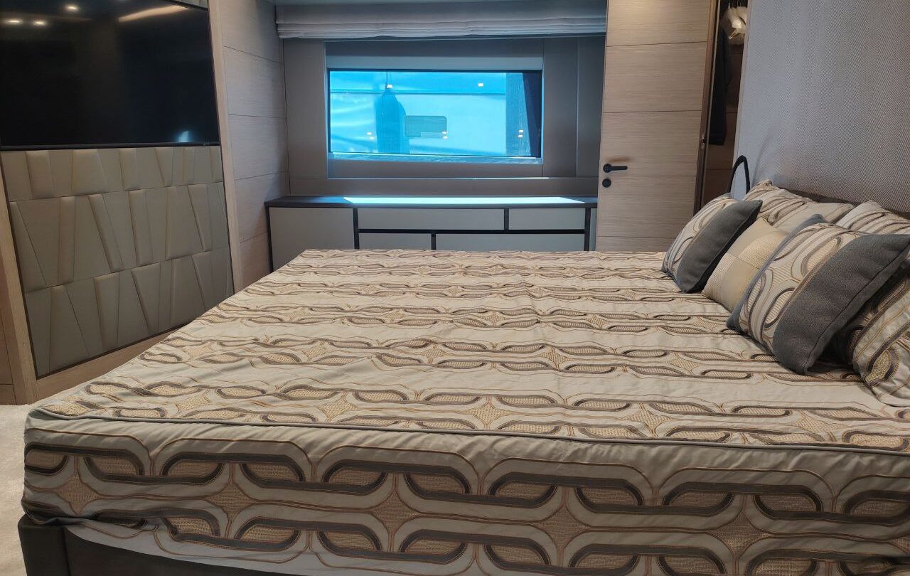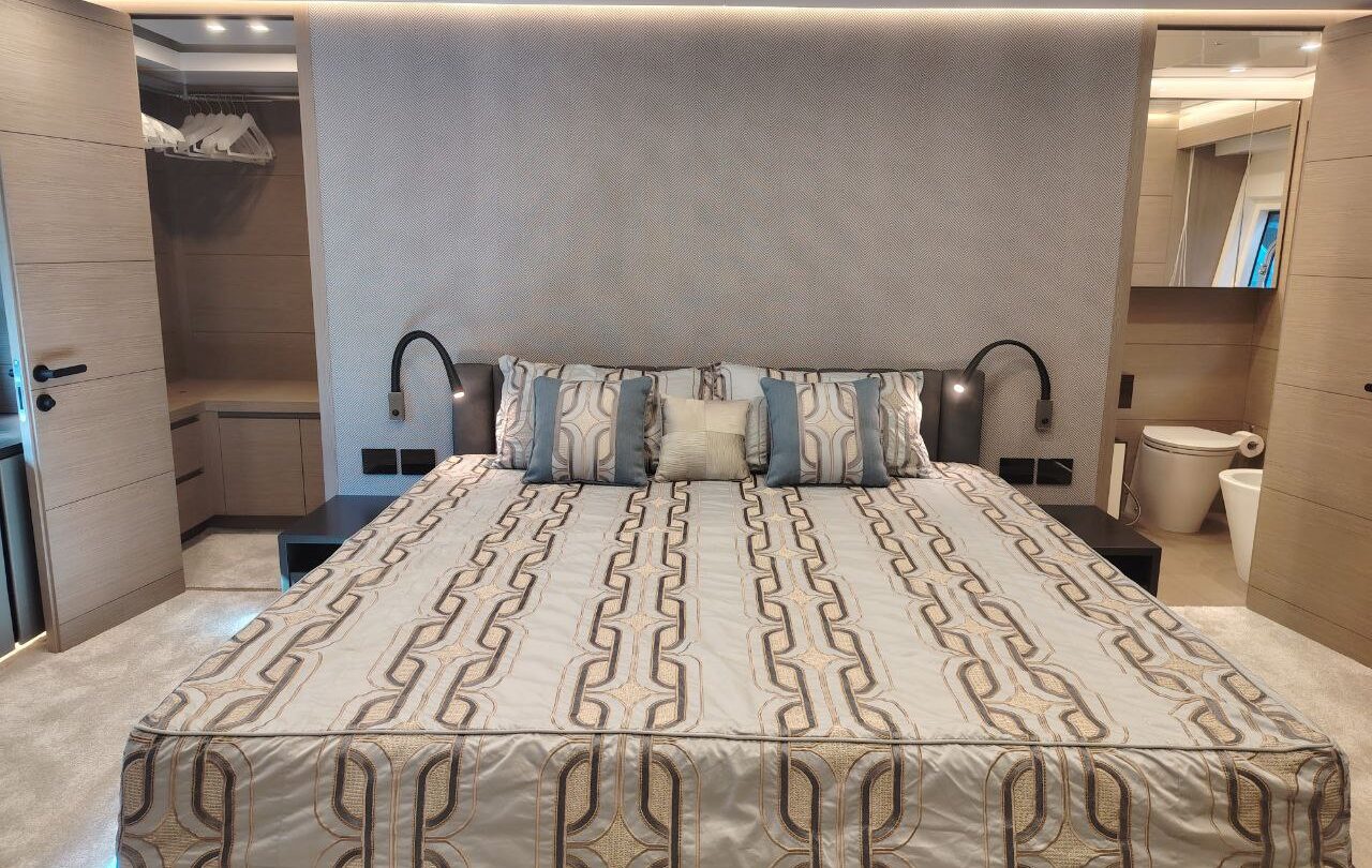 Questa possibilità di customizzazione vale sia per il ponte principale sia per quanto riguarda il piano cabine, che comprende 4 unità, tra cui una vip, una master a tutto baglio con finestre larghe e oblo apribili in ogni ambiente, ognuna col proprio bagno. In totale lo yacht può accogliere fino a 9 ospiti, oltre a 4 membri dell’equipaggio, ed è dotato di una cucina con accesso sia dall’esterno sia dall’interno.