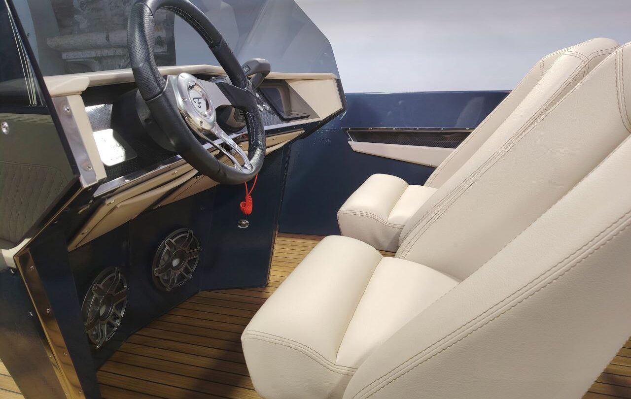 Il restauro parte dalla verniciatura esterna con un colore blu metallico, proposto anche tra le palette Frauscher per le imbarcazioni di nuova produzione. Per quel che riguarda gli interni è stata sostituita la cuscineria, aggiungendo il particolare del diamond stitch, con un decoro a rombi e cucitura a contrasto.