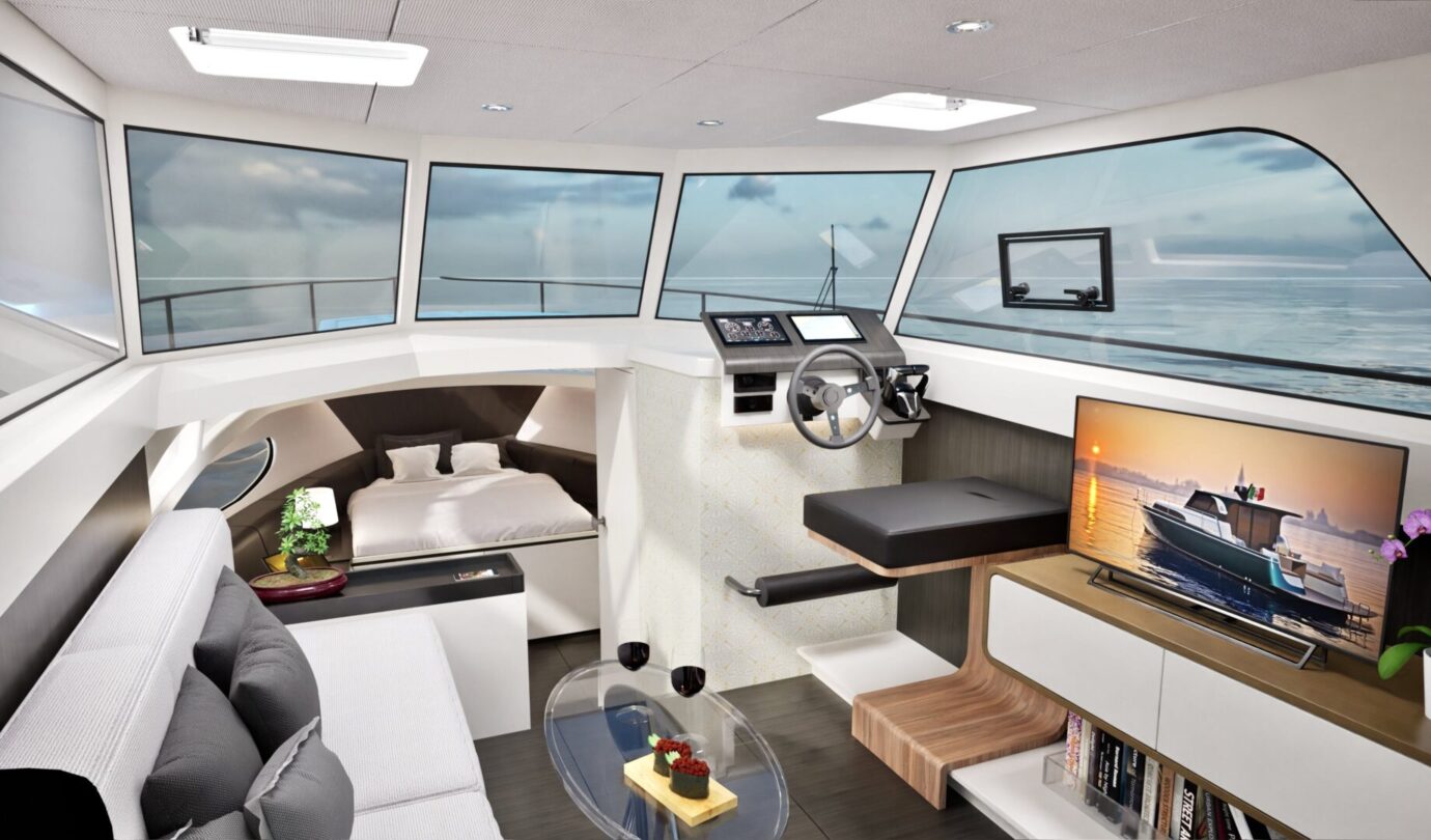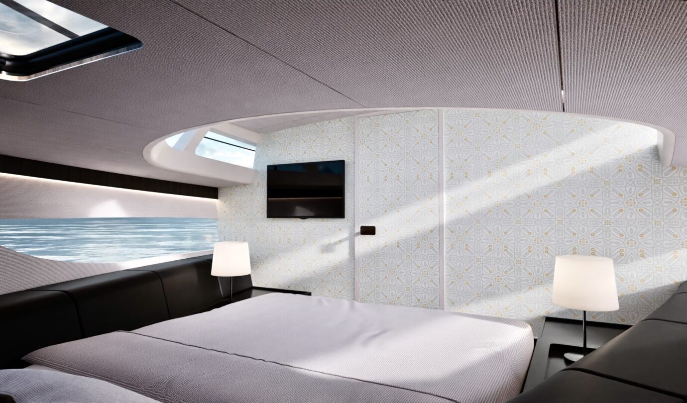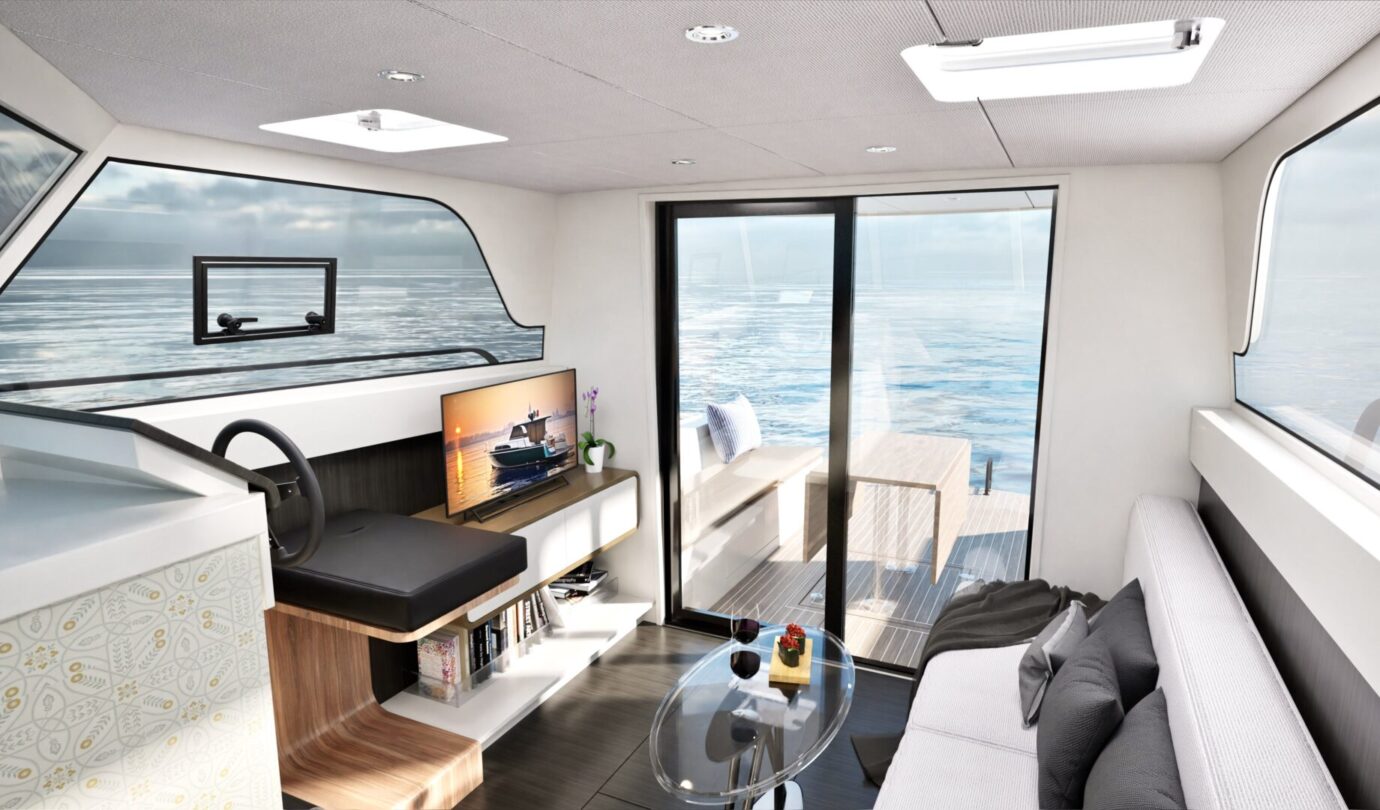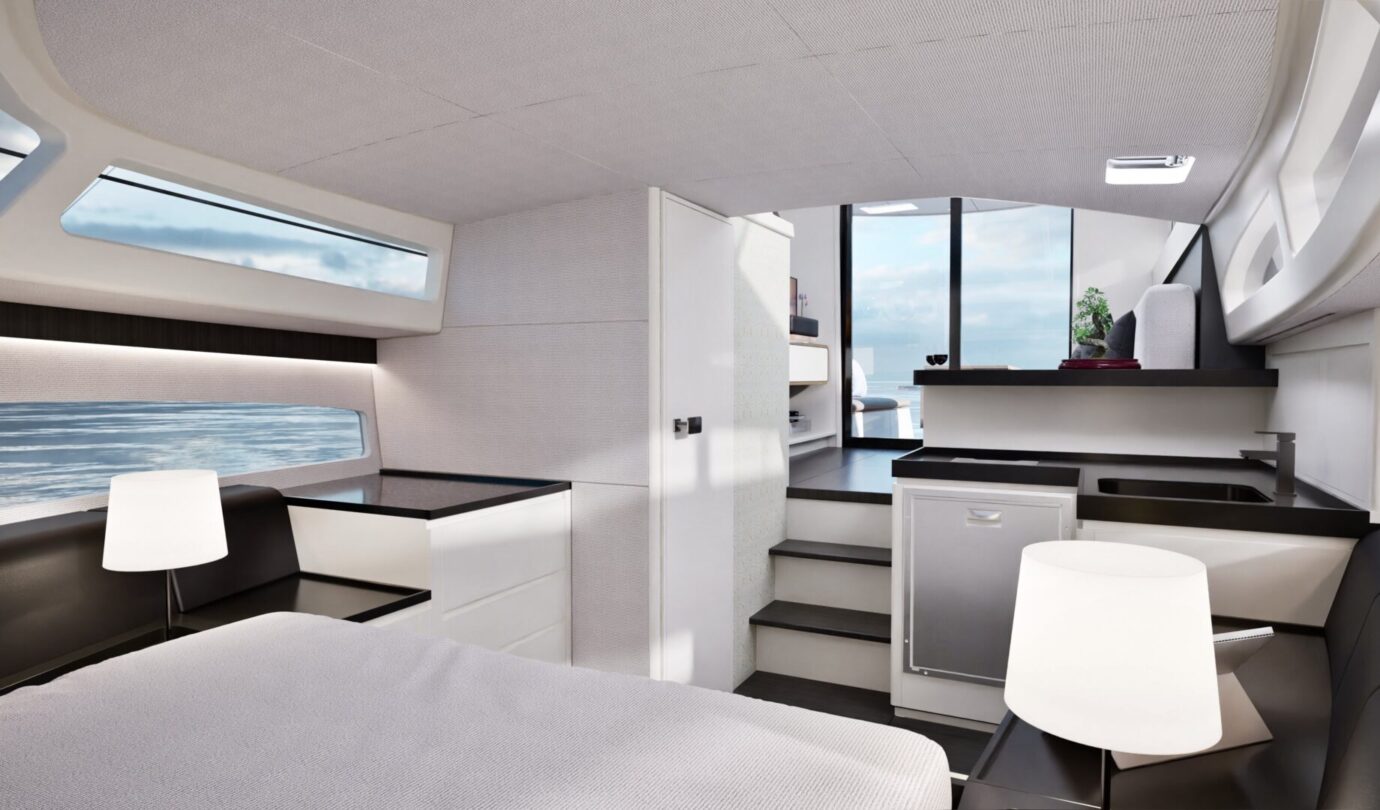 All’esterno il pozzetto di oltre 4 metri si apre verso il mare con lunghe panche conviviali e una generosa plancetta di poppa, che può essere lasciata completamente aperta oppure chiusa, mentre gli interni, ispirati ai loft newyorkesi, si sviluppano in un ampio open space luminoso grazie alle vetrate che corrono da prua a poppa. Sono disponibili due configurazioni: quella classica che offre due cabine indipendenti con possibilità di scegliere tra letti a castello e letto matrimoniale e quella che prevede una sola cabina e bagno separato.