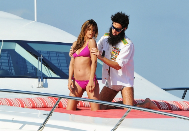 È nuovo amore? George Clooney è già caduto nel dimenticatoio? Nulla di tutto ciò: la showgirl sarda e Baron Cohen, buoni amici, hanno organizzato una goliardata a bordo dello yacht dell’attore – che, a quanto pare, apprezza le barche Made in Italy, come testimonia il suo 92 piedi sfornato da Overmarine – per lanciare la sua nuova commedia, intitolata “Il Dittatore” e prodotta dalla Paramount. Il film narra l’epica storia del generale ammiraglio Aladeen che rischia la vita per assicurarsi che la democrazia non prenda mai piede nel Paese che ha così amorevolmente oppresso.