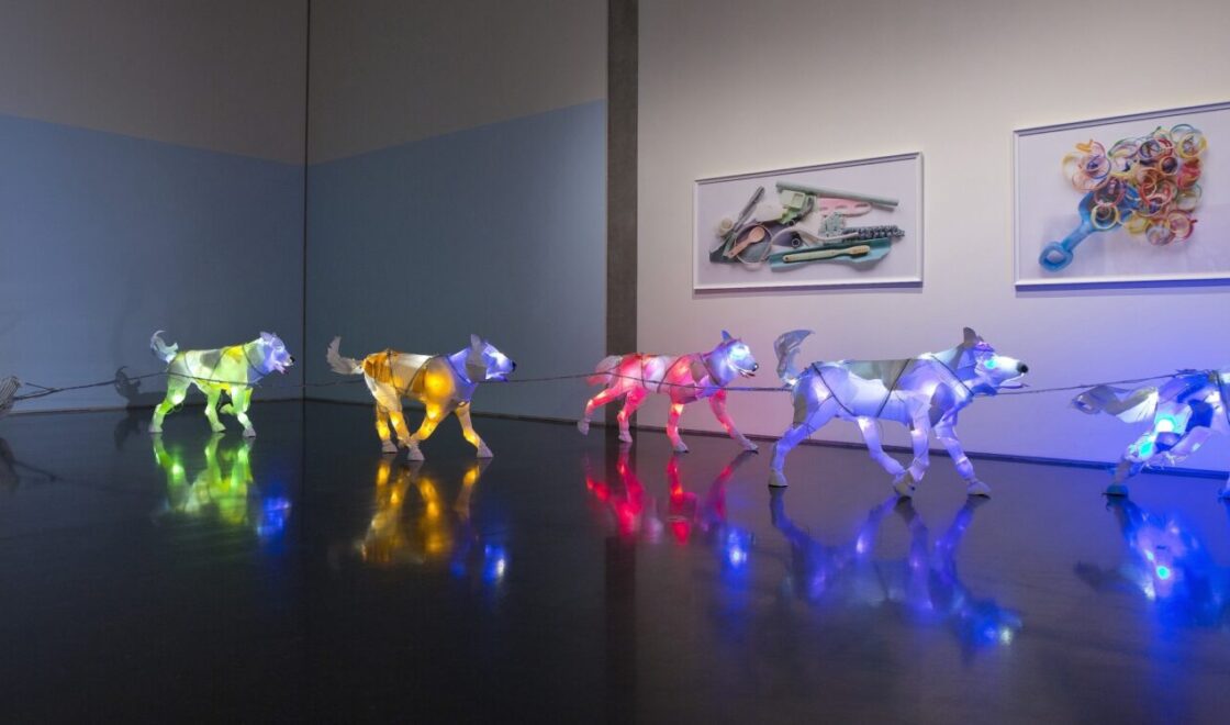 “Inizialmente – ha spiegato l’artista – avrei voluto intraprendere il viaggio di raccolta della plastica che faceva parte del concept del progetto ma non era possibile. Inoltre, la curatrice, Julie Decker, mi invitò a realizzare un’opera specifica per la mostra. A quel tempo il mio lavoro si concentrava sugli animali, così scelsi di ritrarre i cani da slitta, centrali per la comprensione di una mia esperienza rurale in Alaska. Sculture che puntano al problema dell’inquinamento realizzate con la plastica di scarto dell’area di Los Angeles, che, dai tombini della città, a ogni pioggia finisce nell’Oceano Pacifico. Le correnti poi la catturano e la fanno roteare in giro per il mondo nei vortici oceanici, finendo in parte lungo le spiagge dell’Alaska, dove in alcune zone è profonda fino alle ginocchia”.