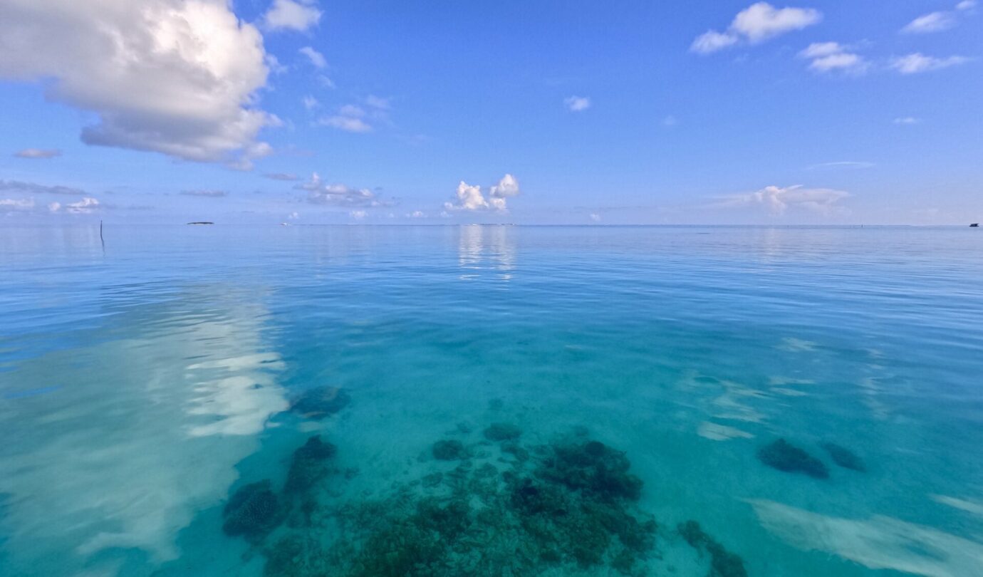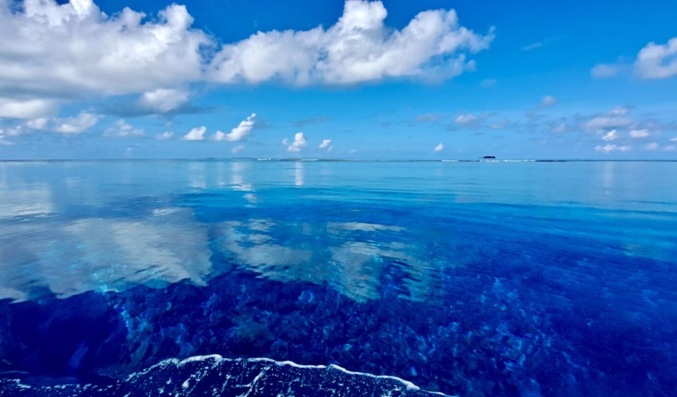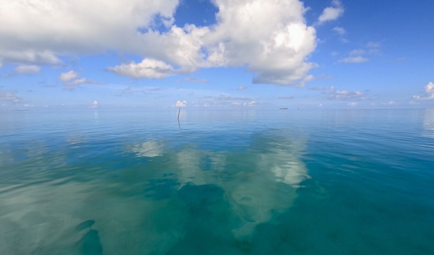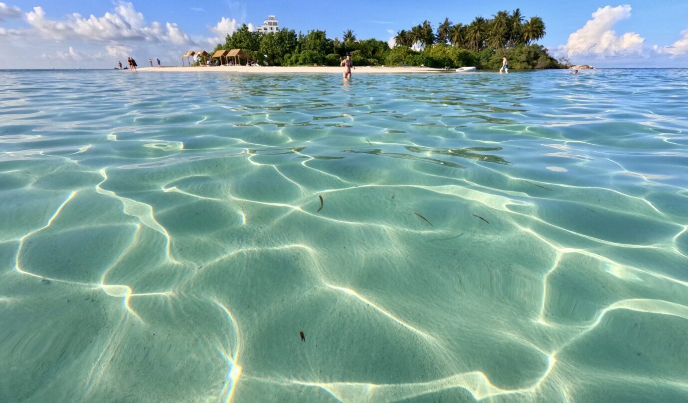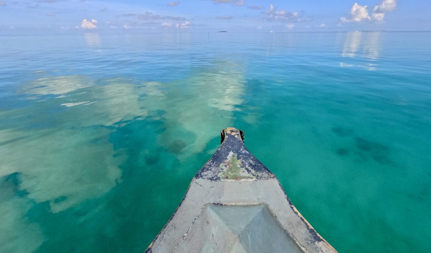 La barca procede con apparente velocità su uno specchio d’acqua calmo come una tavola. Si tratta di un vecchio dhoni maldiviano che solca le acque con esperienza e taglia una superficie dove si mescolano colori ed effetti ottici pazzeschi che solo in questi luoghi riesci a trovare. Da un lato le bianche nuvole che attraversano il cielo azzurro come sbuffi di bambagia e si riflettono alla perfezione sulla superficie del mare, dall’altro un’acqua così limpida che si può vedere il fondale marino distante molti metri sotto la barca.