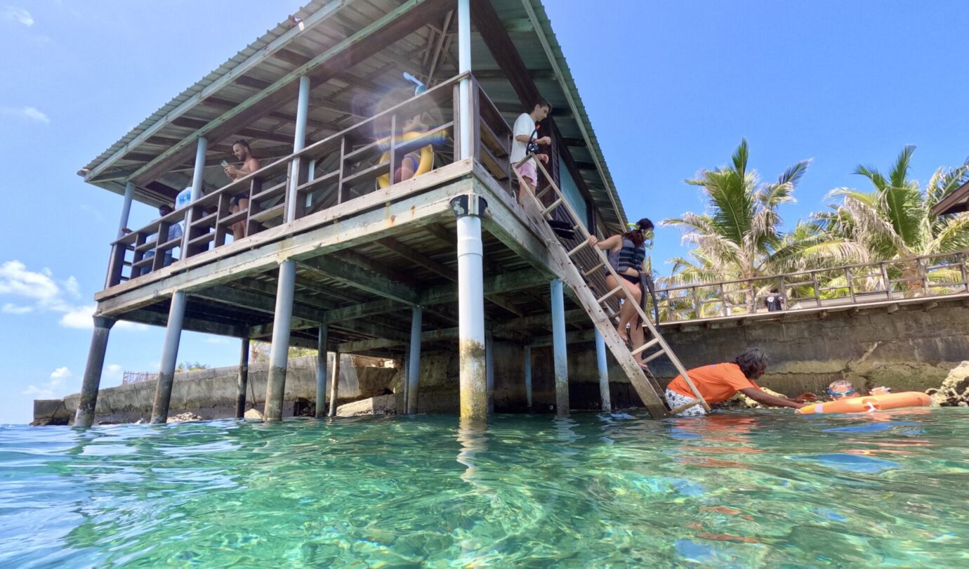 I maldiviani hanno aperto un minuscolo baretto all’aperto, una terrazza coperta dalla quale scendere in mare (stando attenti ai gradini), e guadagnano qualcosa da coloro che vogliono vivere un’esperienza indimenticabile. Agli squali va bene: anche loro si guadagnano qualcosa da mangiare nuotando in pochi metri d’acqua in mezzo a timorosi bipedi. Si tratta di animali adulti, che vanno dai due ai tre metri di lunghezza, con un corpo cilindrico e una testa larga e appiattita.