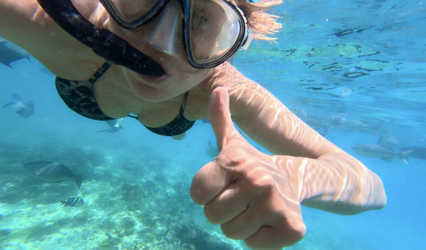 L’effetto ottico è incredibile: navigando hai di solito la superficie del mare davanti e il cielo sopra di te, mentre qui viaggi in 3D, con lo sguardo che passa dalla superficie esterna all’acqua, perché è normale vedere il corallo e la sabbia, incrociare banchi di pesci, un gruppo di delfini, qualche squalo o una tartaruga che nuota con serenità ed eleganza. La temperatura è molto calda ma il viaggio in barca e il consueto venticello ti impediscono di sudare e ti portano a godere la giornata e il paesaggio.