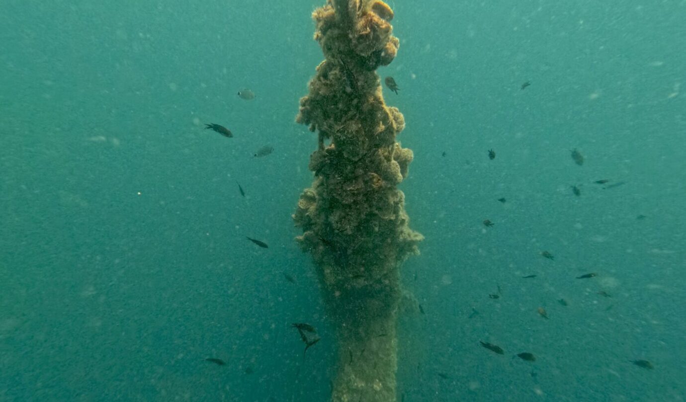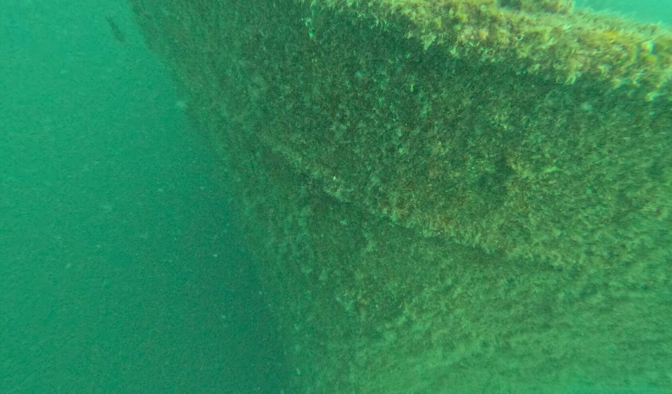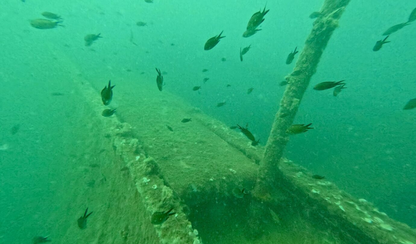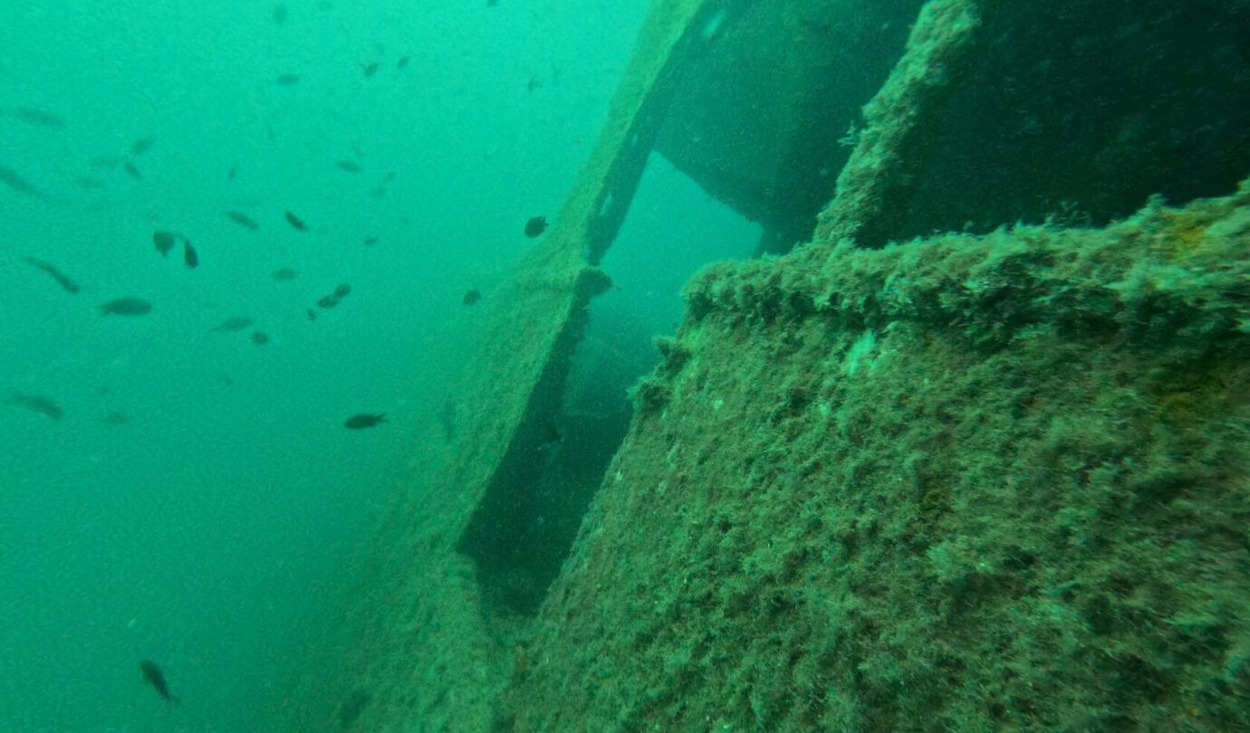 Qui è strapieno di vita: le ostriche hanno completamente colonizzato la struttura e nuvole di pesci continuano a girarci intorno incuriositi dai due mostri vestiti di nero che emettono bolle. Vedere così tanta vita in queste acque è davvero uno spettacolo. La pesca indiscriminata ha fatto una strage qui intorno e le pareti sono di solito deserte ma, come sempre, anche questo relitto è diventato un’oasi di vita marina. Se vi piacciono le storie di mare, immersioni e navi affondate, vi rimando a Storie Sommerse e Relitti e Meraviglie, due libri usciti con la casa editrice Il Frangente. Non ve ne pentirete.