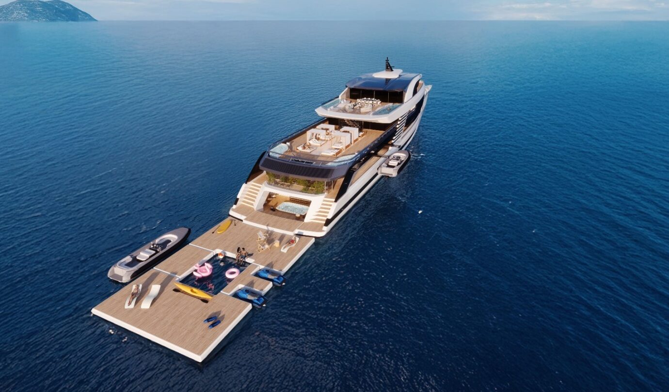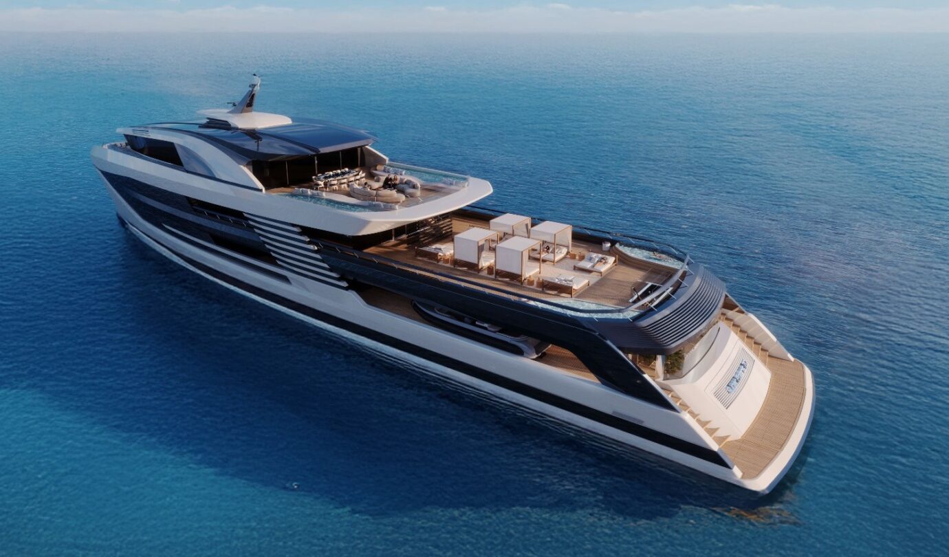 L’upper deck accoglie poi un grande salone e dining, la galley principale, una zona poppiera aperta arredata a seconda delle richieste dell’armatore e, a scelta, un campo da pallavolo, da basket o da padel. Sempre su questo ponte si trova anche la cabina vip di 60 mq, che dispone di due terrazze private di cinque metri quadrati ciascuna.