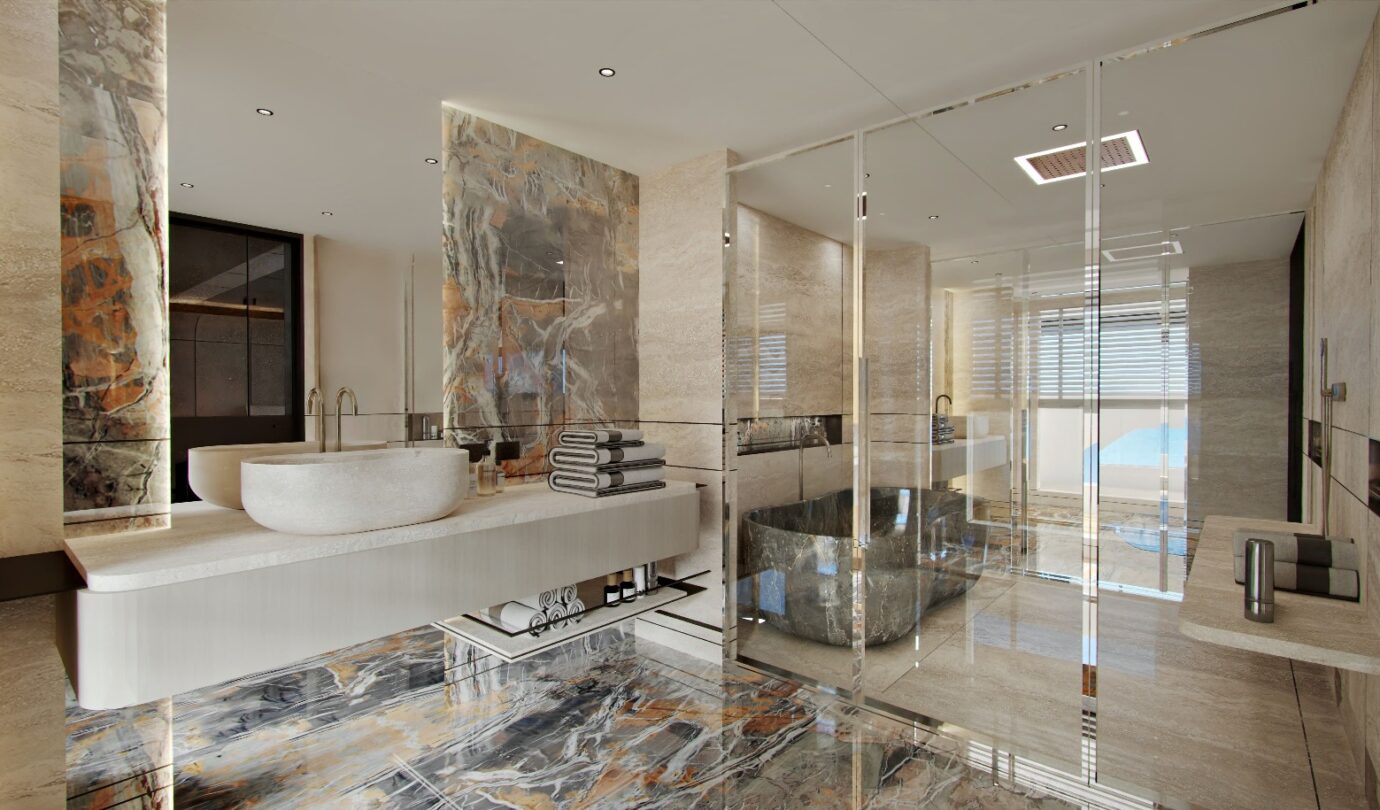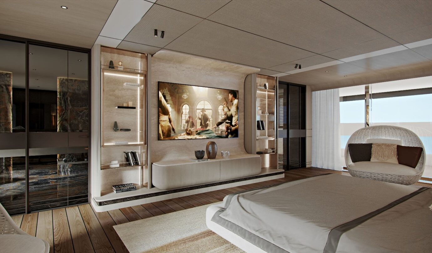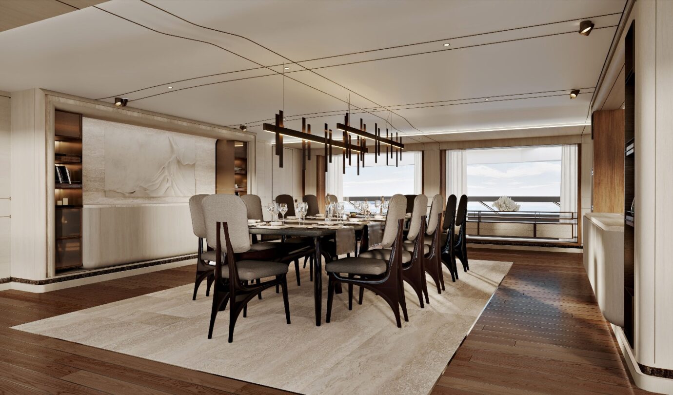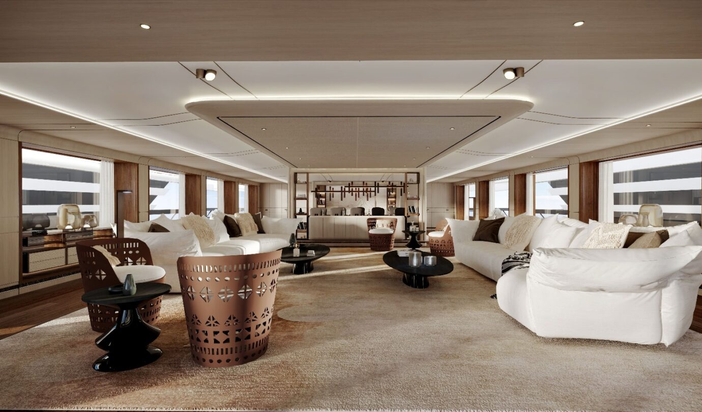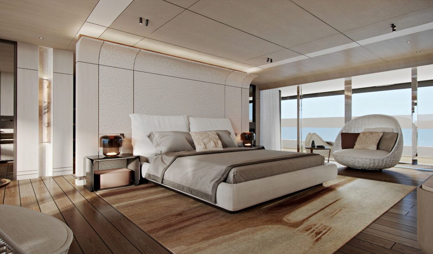 L’idea di concepire il superyacht come una base per l’avventura si riflette nel design degli interni, dove le ampie vetrate creano un costante dialogo tra l’ambiente esterno e gli spazi interni. Il concept ha come obiettivo ricreare ambienti caldi, raffinati e rilassanti. Questo mood è evocato dalla scelta di toni neutri e di una palette cromatica chiara che ricordano l’eleganza naturale di tessuti come il lino, perfetto per le giornate al mare, e il cashmere, ideale per avvolgersi in quelle più fredde.