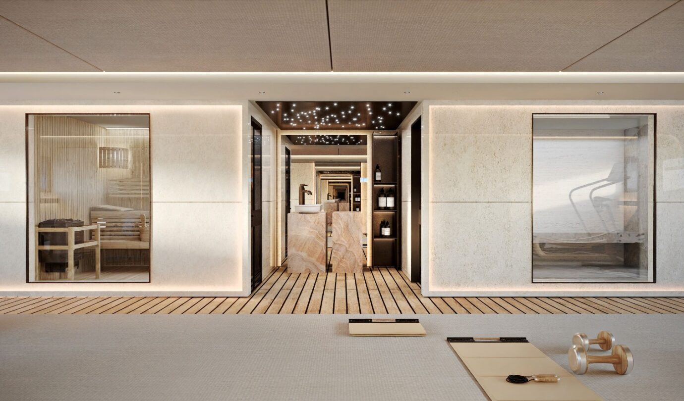 Altro spazio per tender fino agli 8,5 metri e water toys è inoltre disponibile nel lower deck, che ospita due garage con portellone laterale e, a poppa, un beach club di 180 mq con una piscina per il nuoto controcorrente, una palestra e una spa. L’area di prua è invece interamente dedicata allo storage e alle 10 cabine per i 16 membri dell’equipaggio.