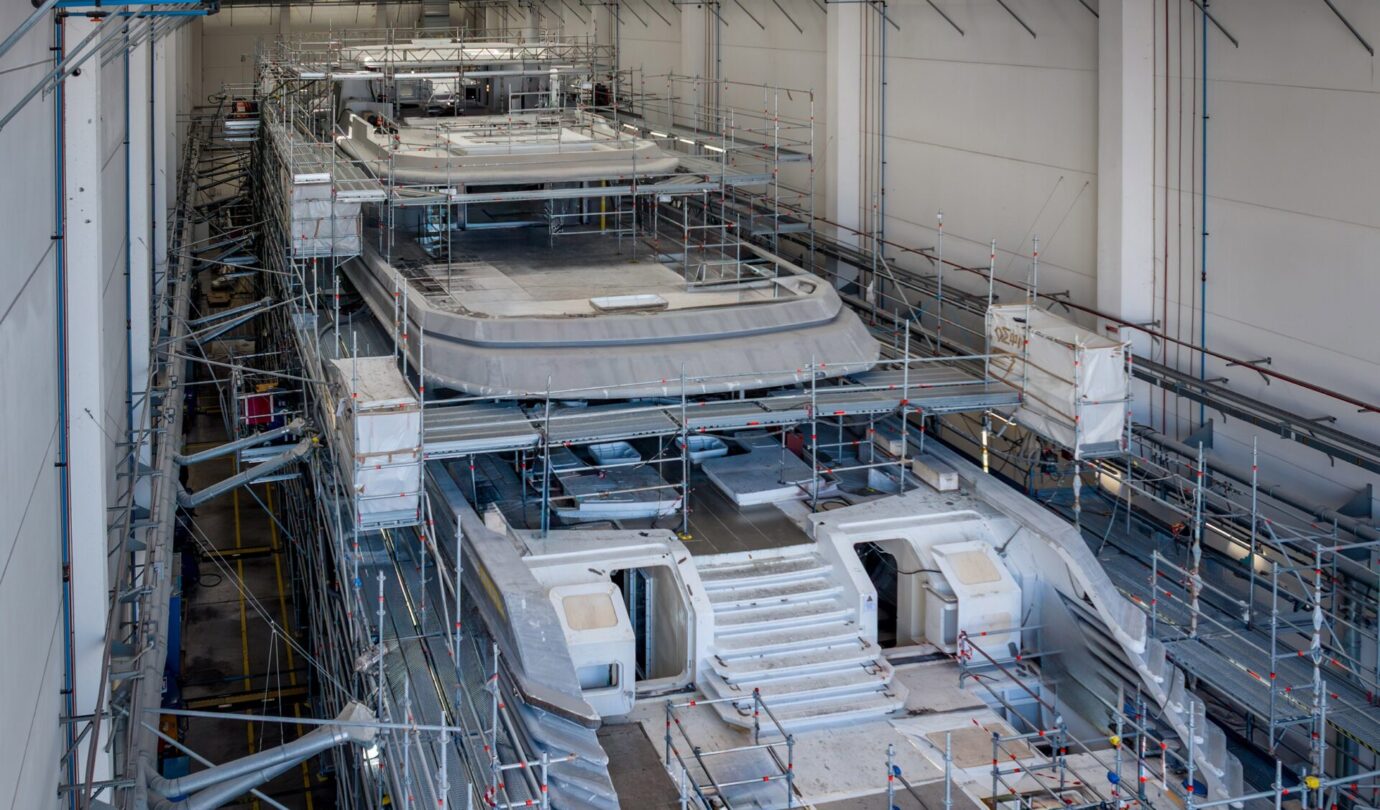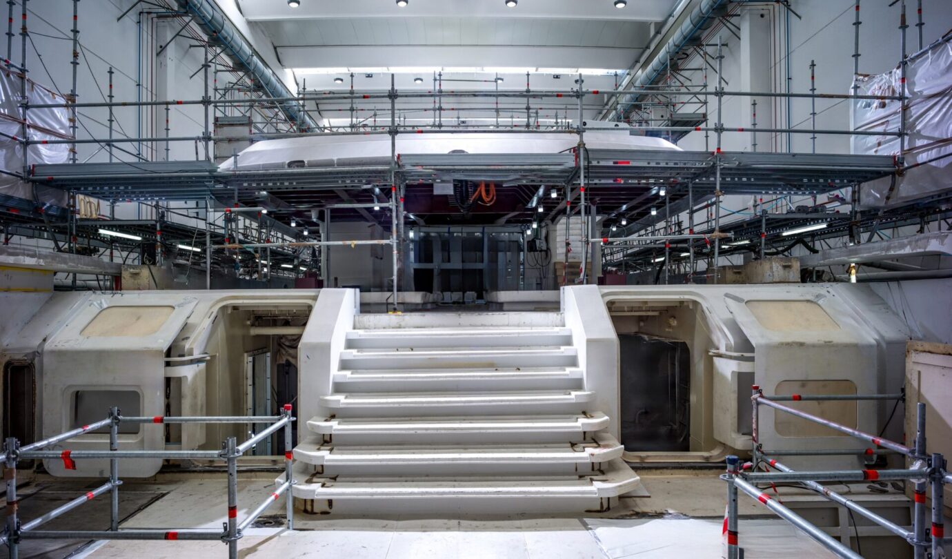Nel pieno rispetto dei tempi di costruzione dell’imbarcazione, la compartimentazione degli interni è stata ultimata ad aprile, mentre durante l’estate inizierà l’installazione degli arredi strutturali del lower deck nelle aree ospiti ed equipaggio. Proseguono anche i lavori nelle aree VIP dell’owner deck, dove le prime cabine rifinite verranno installate tra giugno e luglio, e sono già in corso le ispezioni delle sezioni completate per assicurare la massima qualità artigianale. Sul main deck sono terminate le opere di isolamento delle aree principali, come il main saloon e la plancia, ed è in corso la compartimentazione del ponte. L’installazione dei primi arredi a bordo, prevista tra la tarda primavera e l’inizio dell’estate, rappresenterà un importante traguardo nel processo di allestimento degli interni: si tratta di una fase di trasformazione in cui comincia a prendere forma la particolare atmosfera dello yacht, basata sulla visione e le richieste specifiche dell’armatore.