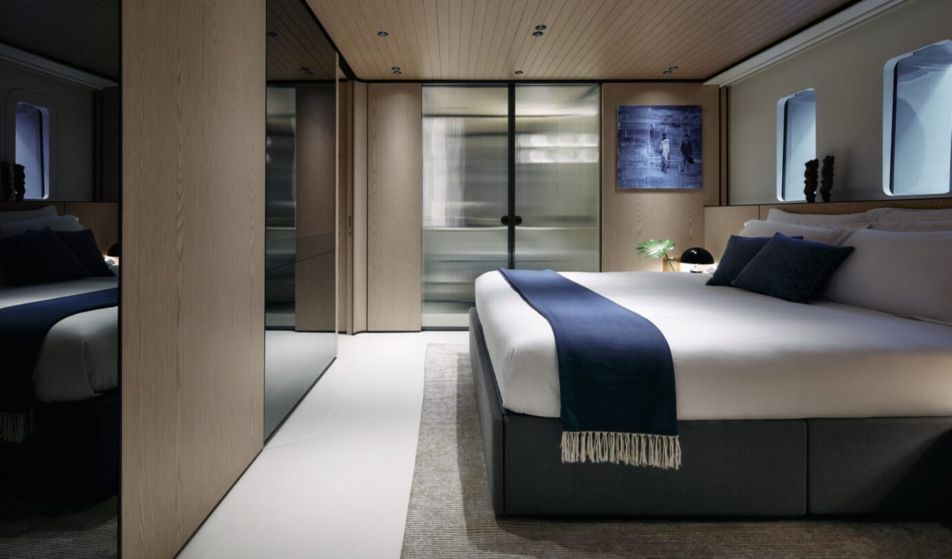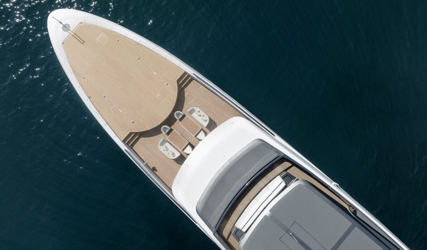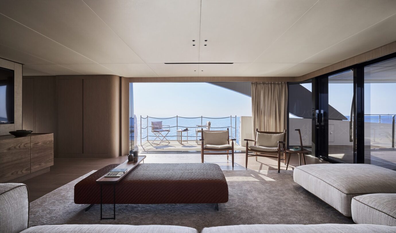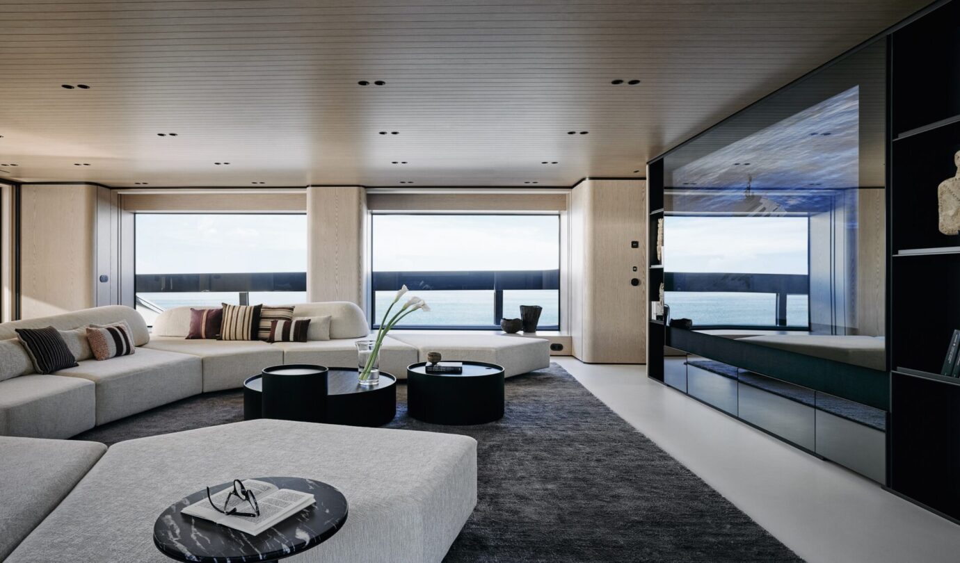 A prua si trova una piscina in vetro e un flybridge di circa 85 mq, mentre a poppa il beach club e le terrazze apribili creano un’ampia piattaforma a livello dell’acqua che esalta il legame con il mare. La suite armatoriale di 55 mq è situata a prua, sul ponte principale, e il garage laterale per il varo trasversale del tender garantisce che la funzionalità non vada ad intaccare l’eleganza formale dello yacht.
