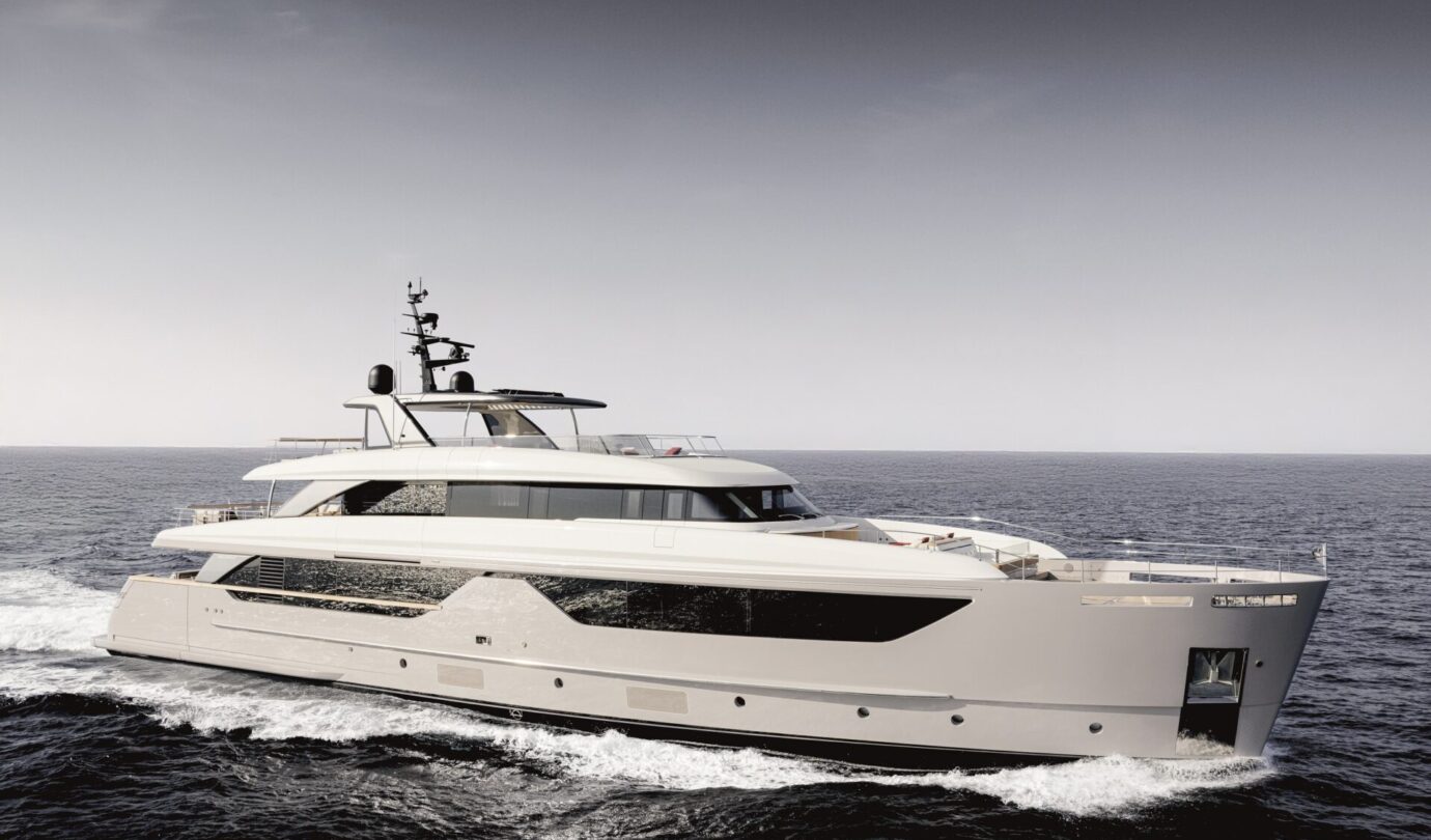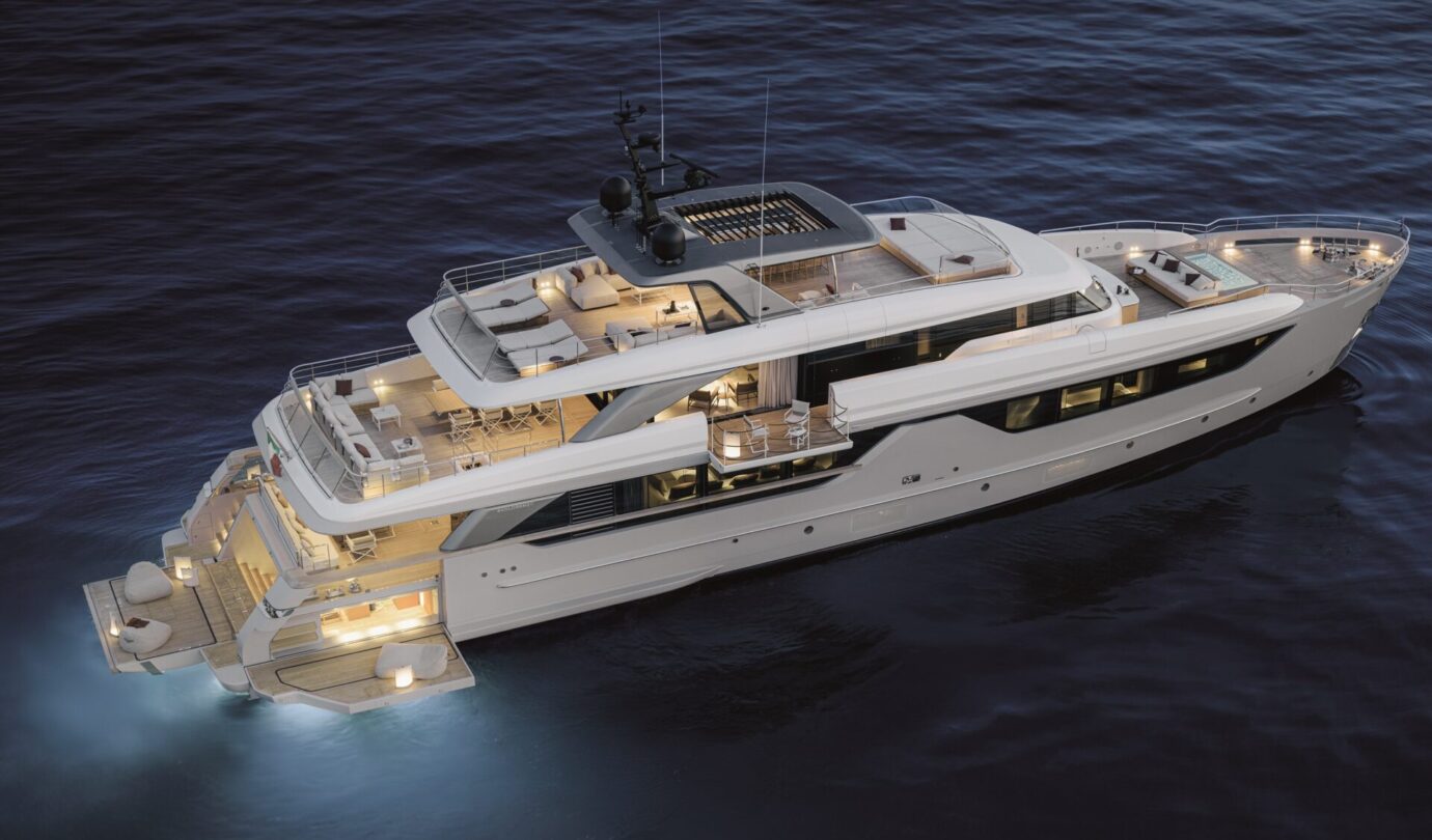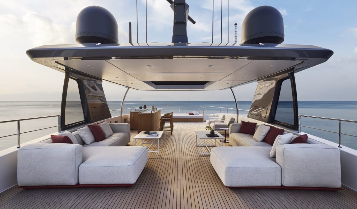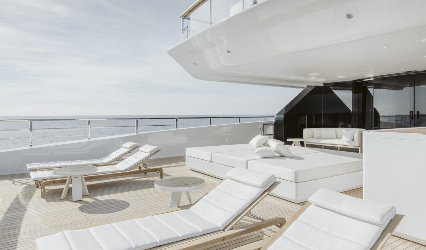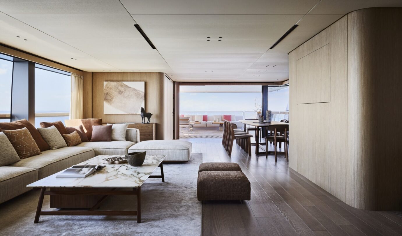 A prua si trova una piscina in vetro e un flybridge di circa 85 mq, mentre a poppa il beach club e le terrazze apribili creano un’ampia piattaforma a livello dell’acqua che esalta il legame con il mare. La suite armatoriale di 55 mq è situata a prua, sul ponte principale, e il garage laterale per il varo trasversale del tender garantisce che la funzionalità non vada ad intaccare l’eleganza formale dello yacht.