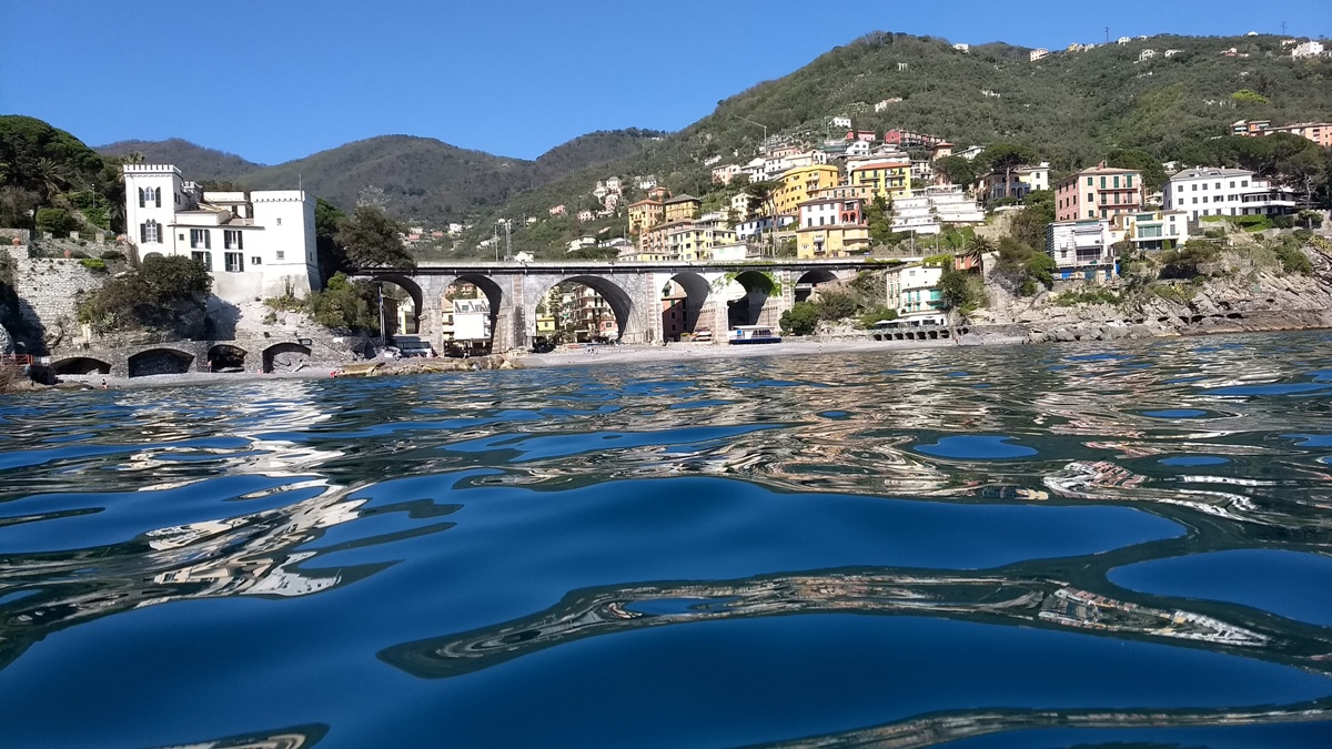 Dopo circa quaranta minuti vediamo il ponte della ferrovia che annuncia l’arrivo a Zoagli ma andiamo avanti e oltrepassiamo la spiaggia: ci muoviamo in direzione Chiavari. In lontananza vediamo la Colonia Fara, la voglia di proseguire c’è ma decidiamo di rimandare quest’itinerario e di rientrare verso Rapallo. Ci avviciniamo alla costa e iniziamo a pagaiare in mezzo a queste insenature e a queste alte scogliere, qualcosa di estremamente suggestivo. Siamo in estasi davanti a questi giganti di pietra, ci fermiamo, osserviamo il deserto blu che ci avvolge e respiriamo a pieni polmoni. Meraviglioso.