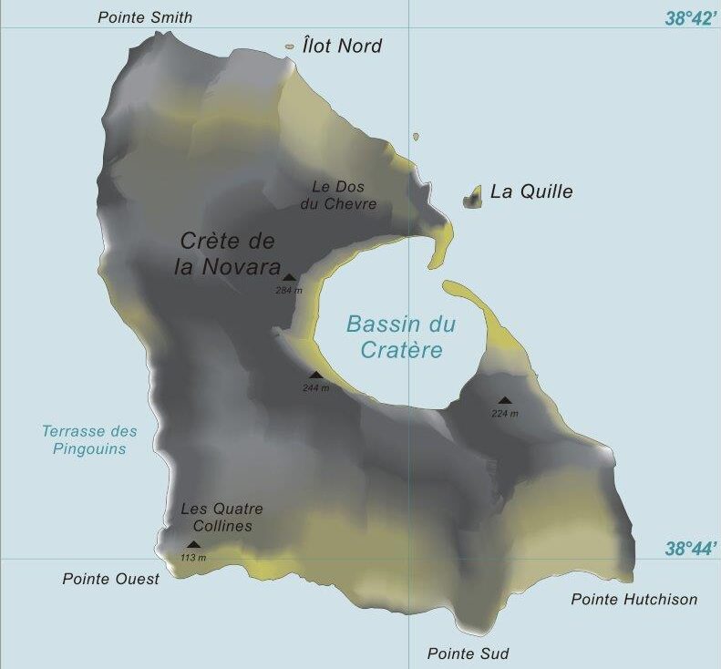 Le Kerguelen, invece, sono un arcipelago situato più a sud, verso l’Antartide. L’isola principale è chiamata Grande Terre o Isola della Desolazione. Si possono quindi ben immaginare le condizioni climatiche, dominate da venti fortissimi, nebbie e nevicate in tutte le stagioni. Nessun albero o arbusto ma una distesa d’erba simile alla tundra.