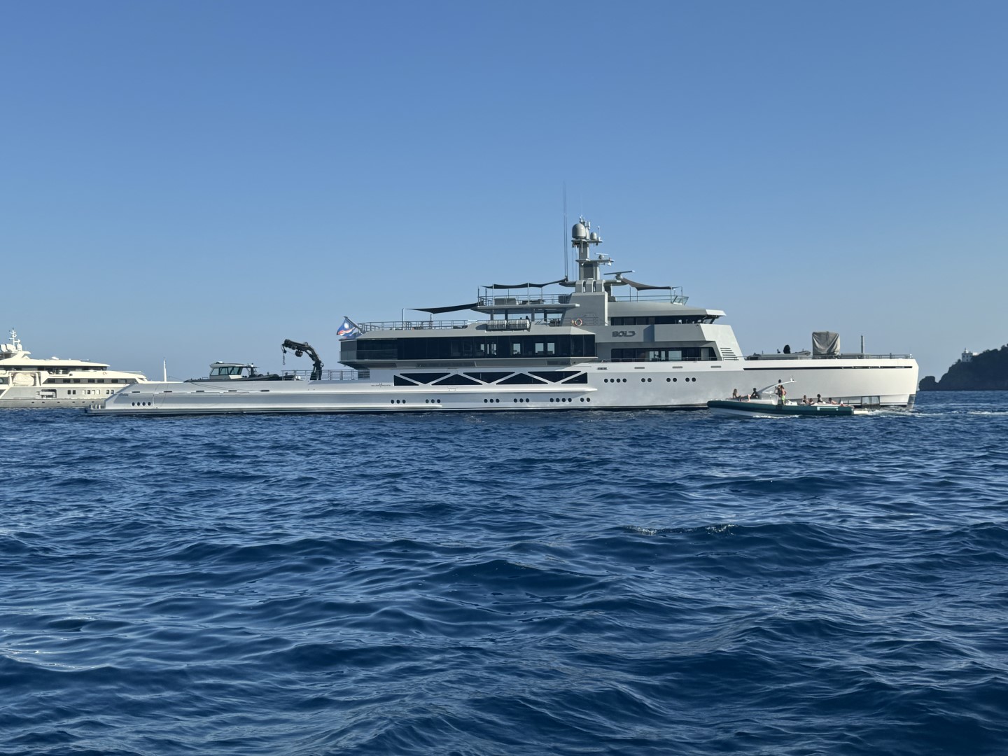 我们在波托菲诺海岸附近看到、拍摄超级游艇 Bold。它让人想起一艘战舰,实际上是一艘超豪华租赁游艇