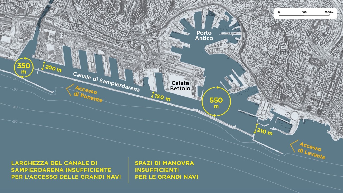Il progetto prevede che per entrare a Calata Bettolo e a Sampierdarena si utilizzi un nuovo ingresso da levante (est), lasciando che le navi da crociera e i traghetti continuino a raggiungere il Porto Antico attraverso l’attuale ingresso da levante. In sostanza ci sarebbero due corridoi di ingresso paralleli: quello attuale per le navi da crociera e i traghetti e quello nuovo per il traffico commerciale che, al traverso di Calata Bettolo, avrebbe a disposizione un avamporto di 800 metri di diametro in cui evolvere.