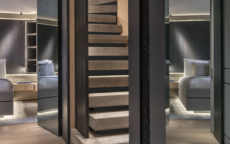 Gli elementi per ottenere questo risultato sono porte scorrevoli a tutta altezza e a scomparsa e arredi quasi totalmente sospesi da terra: la maggior parte dei mobili “galleggia” sul pavimento di legno, a servizio di una successione ininterrotta di ambienti senza soluzione di continuità. Una sensazione accentuata anche dall’utilizzo della luce naturale al pari di una componente architettonica, stemperata e filtrata man mano che si avanza dal ponte esterno verso spazi più chiusi e intimi. È il dialogo tra illuminazione e ombra, con tutti i gradienti possibili tra questi due estremi, che a bordo del motoryacht Ace dà profondità, crea volume, modella la percezione del vivere in barca da parte dei passeggeri.