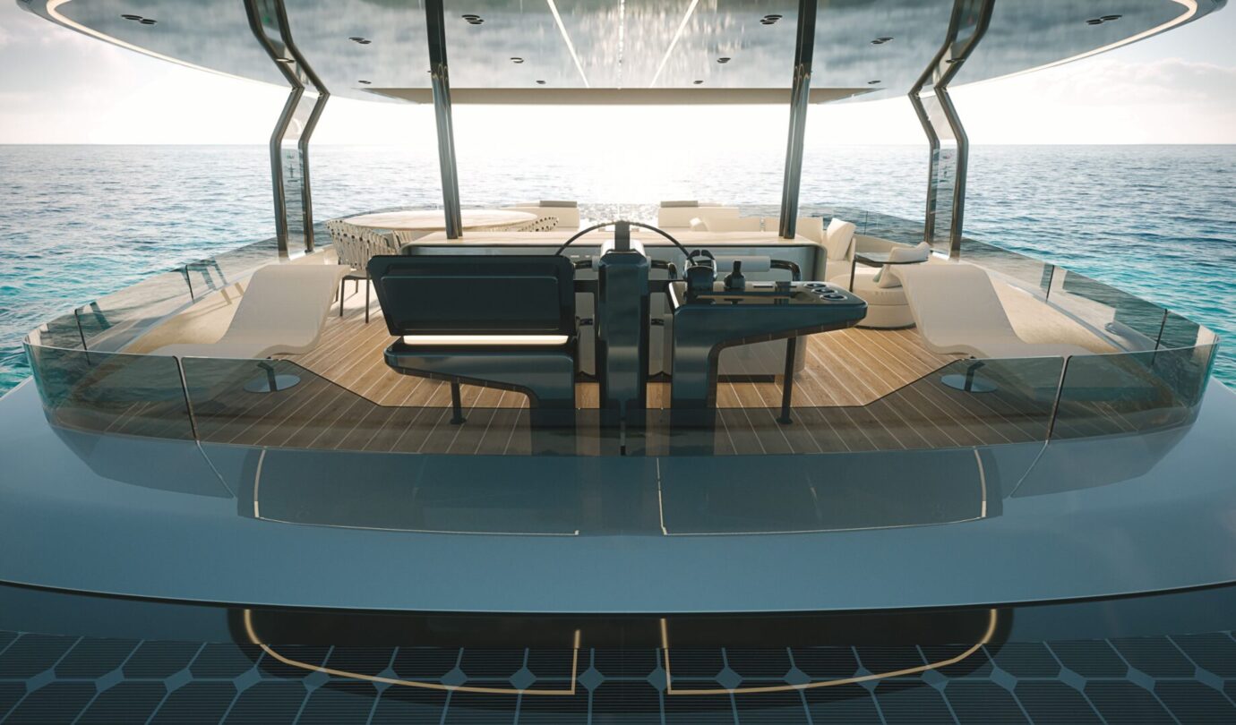 Dal grande flybridge verso poppa, uno spoiler dinamico si solleva durante la navigazione per migliorare la fluidità in navigazione, soluzione innovativa derivata dal mondo automotive. Dolomia D 100 alloggia nel garage a scomparsa un tender di 5 metri. Quasi tutti i catamarani lo alloggiano sulla spiaggia di poppa, mentre il Dolomia D100 offre un vero beach club da 18 metri quadri.