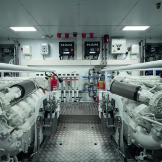 E’ infatti utilizzato per la struttura della libreria dai ripiani di legno, il piano dello scrittoio e del vanity desk, la testiera del letto, il rivestimento della chaise longue con tavolini di legno e le cornici degli specchi del bagno. Quest’ultimo, organizzato per due persone, ha una doccia di pietra d’Orcia e può diventare anche bagno turco. Completano il layout di questo livello pantry e cucina equipaggiata dall’azienda Ernestomeda, accessibili separatamente dall’equipaggio – alloggiato sul ponte inferiore – in modo da garantire privacy agli ospiti.