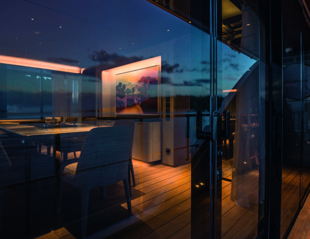 L’insieme è declinato in una palette solo all’apparenza neutra, che ad uno sguardo attento rivela una ricca varietà di tonalità chiare, come il beige e l’avorio, accostate a materie prime lasciate al naturale: teak, rovere, cuoio, lino e addirittura pergamena. L’atmosfera, ammorbidita dalla luminosità proveniente dai tagli dello scafo e da aperture vetrate a tutta altezza, come quelle che delimitano il salone del ponte superiore completamente apribile , è dinamizzata dalle lavorazioni delle superfici, che danno carattere e movimento. Esemplare in tal senso il cielino di rovere listellato, scavato mediante una struttura tridimensionale a “mille righe”, che entra in assonanza con la pavimentazione sempre di legno (ancora rovere o teak) con inserti di listelli a matita scura a contrasto.