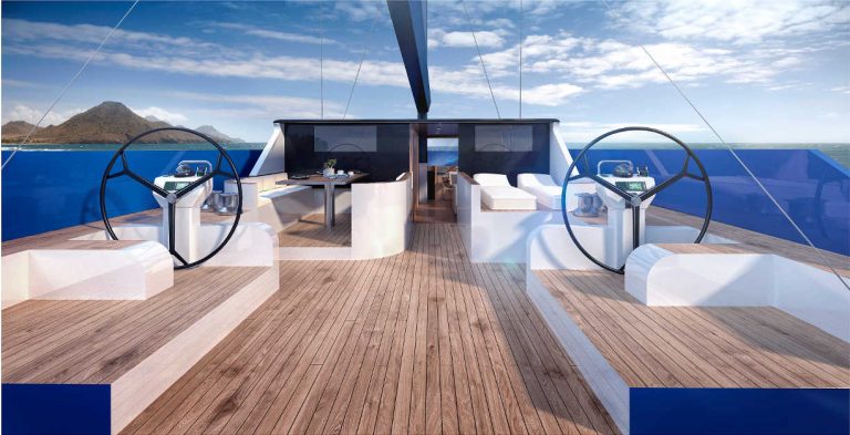 La timoneria, invece, conta su due comandi di navigazione all’interno e, grazie alla potenza dei due motori entrofuoribordo da 400 cavalli, l’Awake riesce a raggiungere una velocità di crociera di 15 nodi. “Quando si vuole navigare a vela -ha sottolineato Lappon- i due motori possono essere alloggiati in un vano a scomparsa in modo da non avere appendici in acqua”.