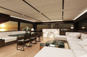 L’utilizzo del teak per il rivestimento delle murate conferisce all’insieme ulteriore eleganza senza tempo e il disegno allungato della sovrastruttura aumenta la qualità degli spazi interni. I quali comprendono, nella versione standard, una cabina armatoriale, una vip e due per gli ospiti, più un alloggio per l’equipaggio in uno dei due scafi.