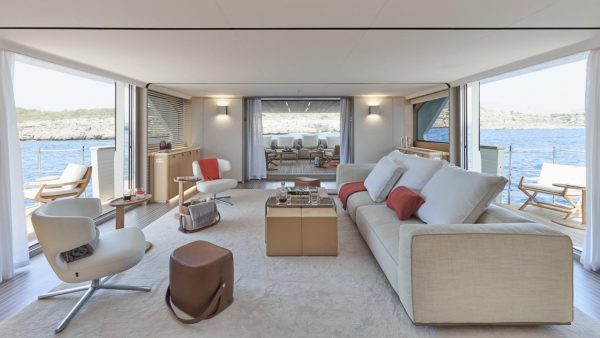 Da questa visione è nata una imbarcazione open space, con un ambiente unico e continuo da prua a poppa, senza soluzione di continuità anche tra interno ed esterno, grazie alle ampie vetrate e con cucina a vista per sottolinearne la peculiarità “sociale”. Un risultato scenografico ottenuto mediante l’eliminazione di alcune zone di servizio ritenute inutili e la riduzione degli spazi tecnici a favore dell’apertura spaziale interna. Particolarmente elastico il layout distributivo, che permette di scegliere tra diverse configurazioni, da quella più estrema senza alcuna partizione a soluzioni più tradizionali. Per la prima, tra l’altro, è possibile decidere dove posizionare la cabina armatoriale.