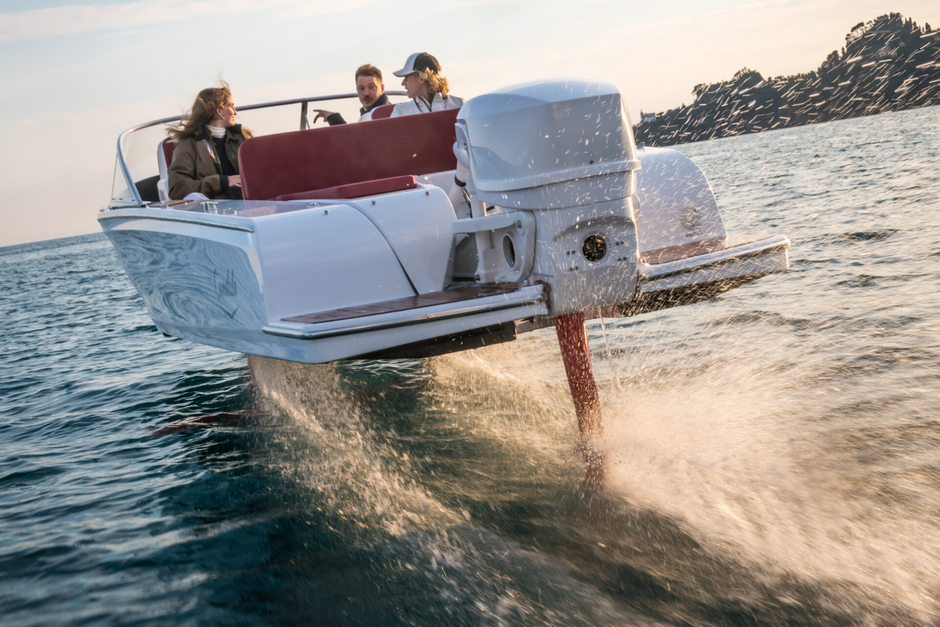 We can truly talk about lift-off because of the hydrofoil technology used, with the use of a foil under the keel, the hull of the boat lifts up reducing the friction of the water by approximately 80%. The foil, completely submerged, works like “underwater wings”, like on Luna Rossa, making it possible to navigate long distances with only the energy from the battery.