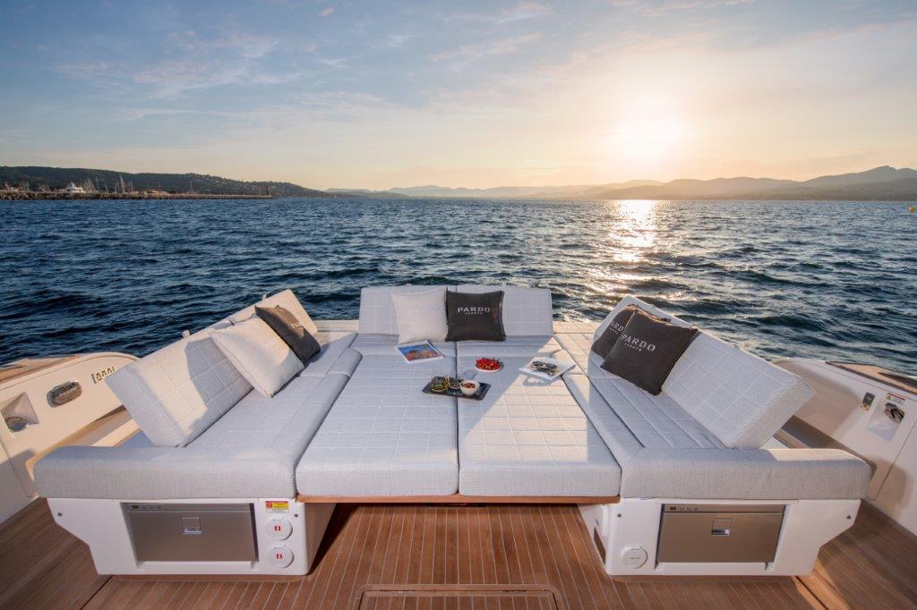 Also on the stern, the bridge is 60cm longer than on the Pardo 50, allowing the owner to store, launch and recover the tender or jet skis, thanks to a practical electric system. Design choices that highlight the attention to space made available to passengers.