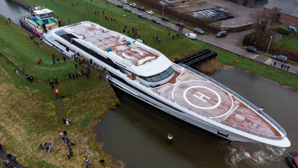 After four years under construction, the 80-metre mega yacht, “Galactica” left the Heesen shipyard. The maiden voyage along the Dutch canals was a sight