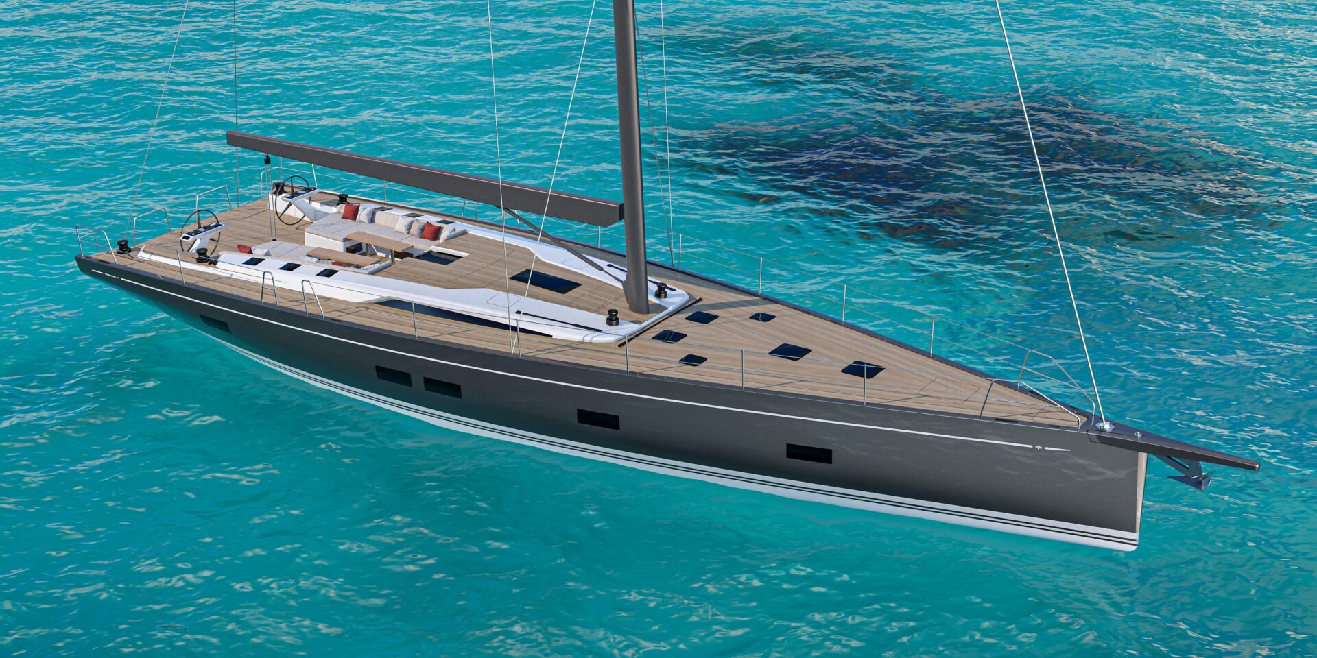 The important dynamic length, thanks to the slim lines and low wet surface, allows for the slimming of the stern to reduce friction of the hull while sailing. This improves dynamic speed and stability when swerving, translating into improved performance in conditions of light wind, typical of the Mediterranean area, and improved ease and safety while sailing.