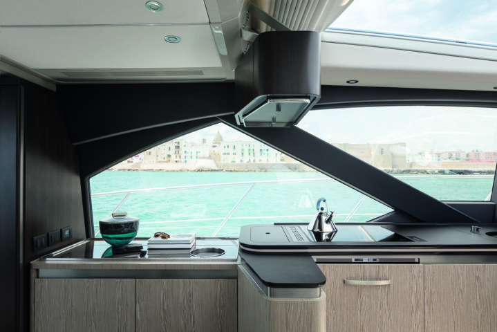 On the main deck of the S6 Azimut Yachts, just like in the latest generation of sports vessels, is the outdoor kitchen, which reflects style details from the interior: light-veined wooden doors, Lapitec worktops – sintered stone slabs created by putting mixtures of natural raw materials under high temperature and pressure – in dark brown, with an irregular surface recalling natural stone, with an integrated sink and hob.