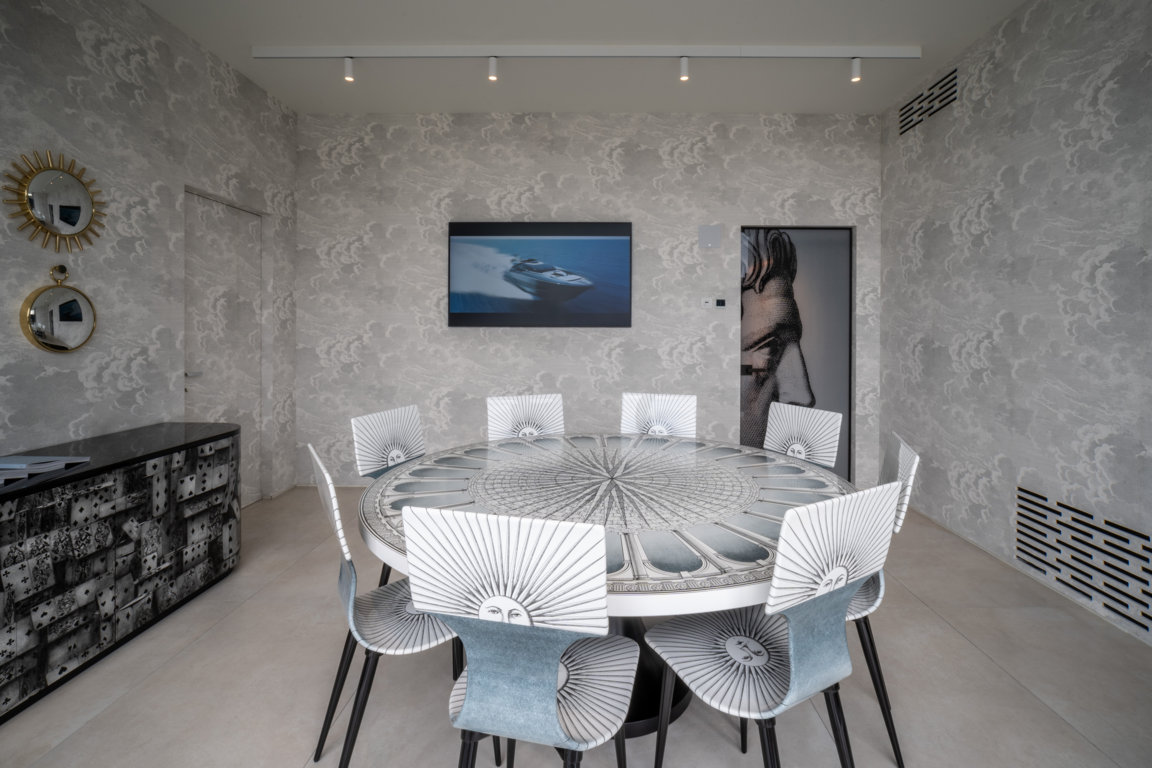 In order to celebrate this partnership, which will be revealed in the interior design of the next Riva and Custom Line yachts, the private room at Riva’s La Spezia shipyard has been furnished and accessorised by Fornasetti.