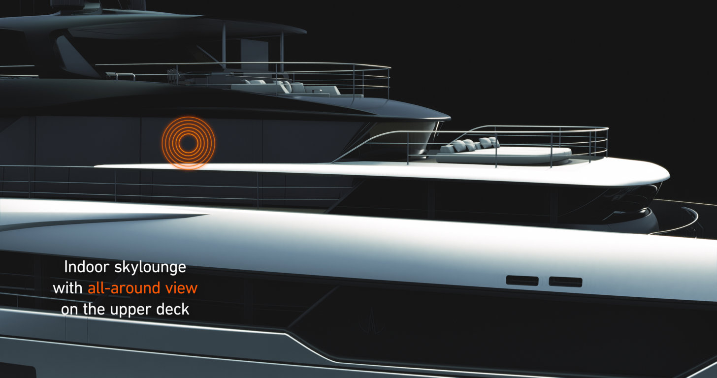 According to the concepts byFulvio De Simoni , the fleet shares a number of unique design characteristics, in addition to technical innovation. Among these is the ample hull, which increases stability as well as liveability on board, the spacious terraces with different functions (pool, bar, barbecue and solarium), which can also be protected during navigation by portable windbreaks, and panoramic windows that bring plenty of natural light inside and connect visually with the outside space.