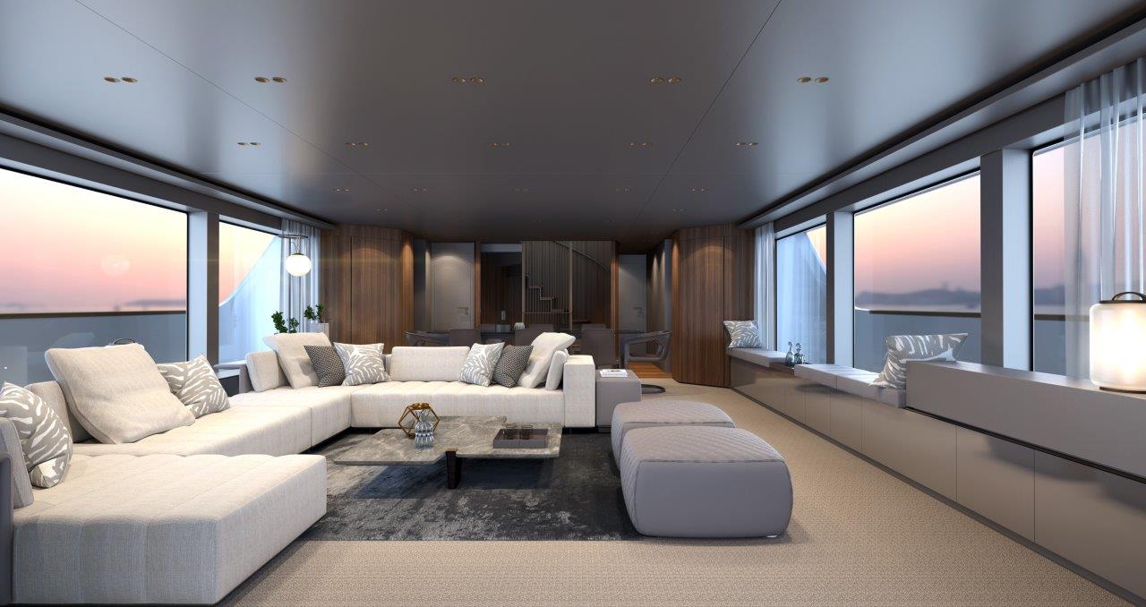 The left-hand side has a side deck with no breaks in the continuity between the bow and the stern, along which the bulwark in correspondence with the living room opens up to form a terrace, the right-hand side is presented as a wide body hull. In this manner, the deck furthest from the sea allows passengers to feel closer to the water, its light, and colours, both visually and emotionally.