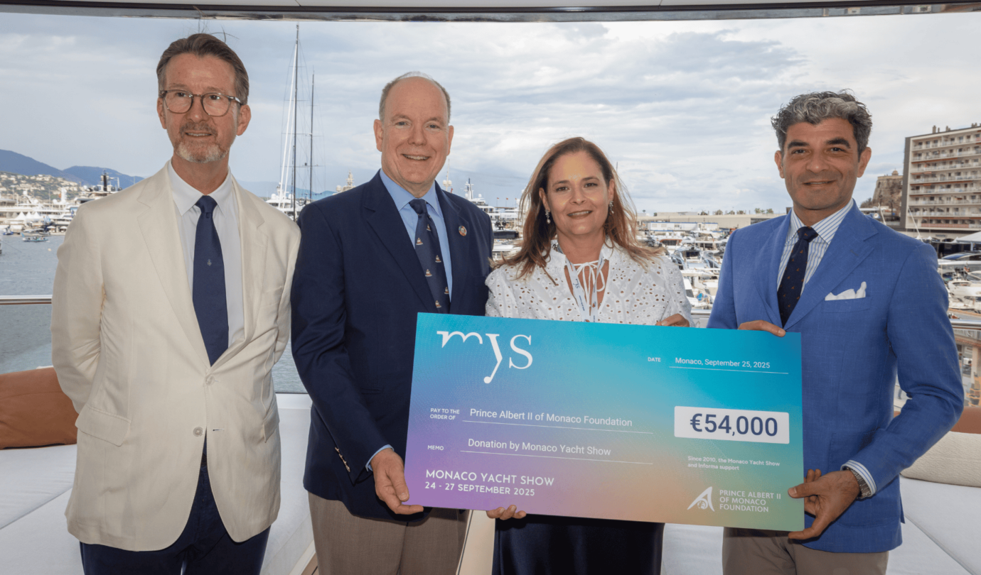 During his official visit to the 34th edition of the Monaco Yacht Show, Prince Albert II of Monaco received a donation of 54,000 euros for his Foundation, H.S.H. Prince Albert II of Monaco. The contribution was presented by Gaëlle Tallarida, general director for the MYS, and by Lord Stephen Carter, CEO of Informa Group, in the presence of Olivier Wenden, vice-president and CEO of the Foundation, who expressed his gratitude for the yearly support which began in 2010.