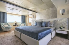 To the bow is the owner’s suite with private balcony, an ample dressing room and luggage area personalised in every detail. The garage is also to the bow, and can hold a 6.25 metre tender, a jet ski, a rescue boat and four seabobs.