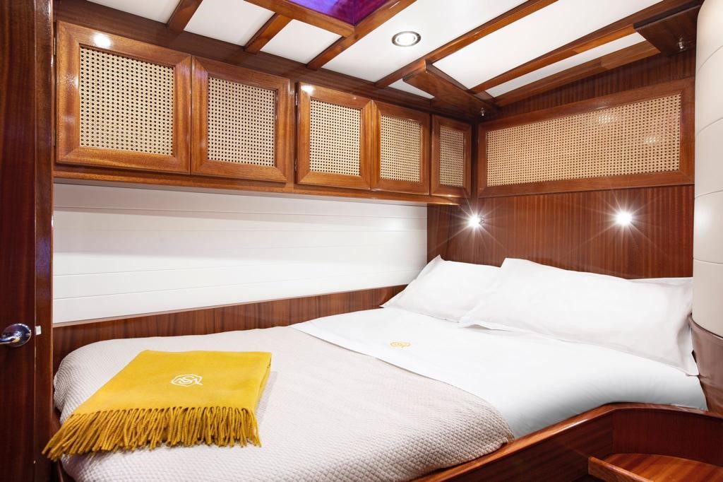 Of note is certainly the owner’s cabin, with a chesterfield sofa and a functional leather desk. Following a philosophy of maximum comfort, the bathroom in the owner’s cabin is separate, as is the bathroom for the two forward VIP cabins, which have large beds and Viennese style rattan wardrobes. Also to the bow are two guest cabins with bunk beds and separate bathrooms. Crew members have another two cabins, also with bathrooms.