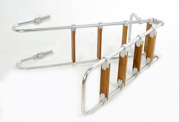 The manual swim platform ladders for yachts and sail boats, are built in an anodised light alloy, supporting fixed steps made in teak. It is foldable and supplied complete with fixing brackets for the hull, 25 millimetres in diameter. Its folding system, allows for fast and easy storage when not in use, taking up little space.