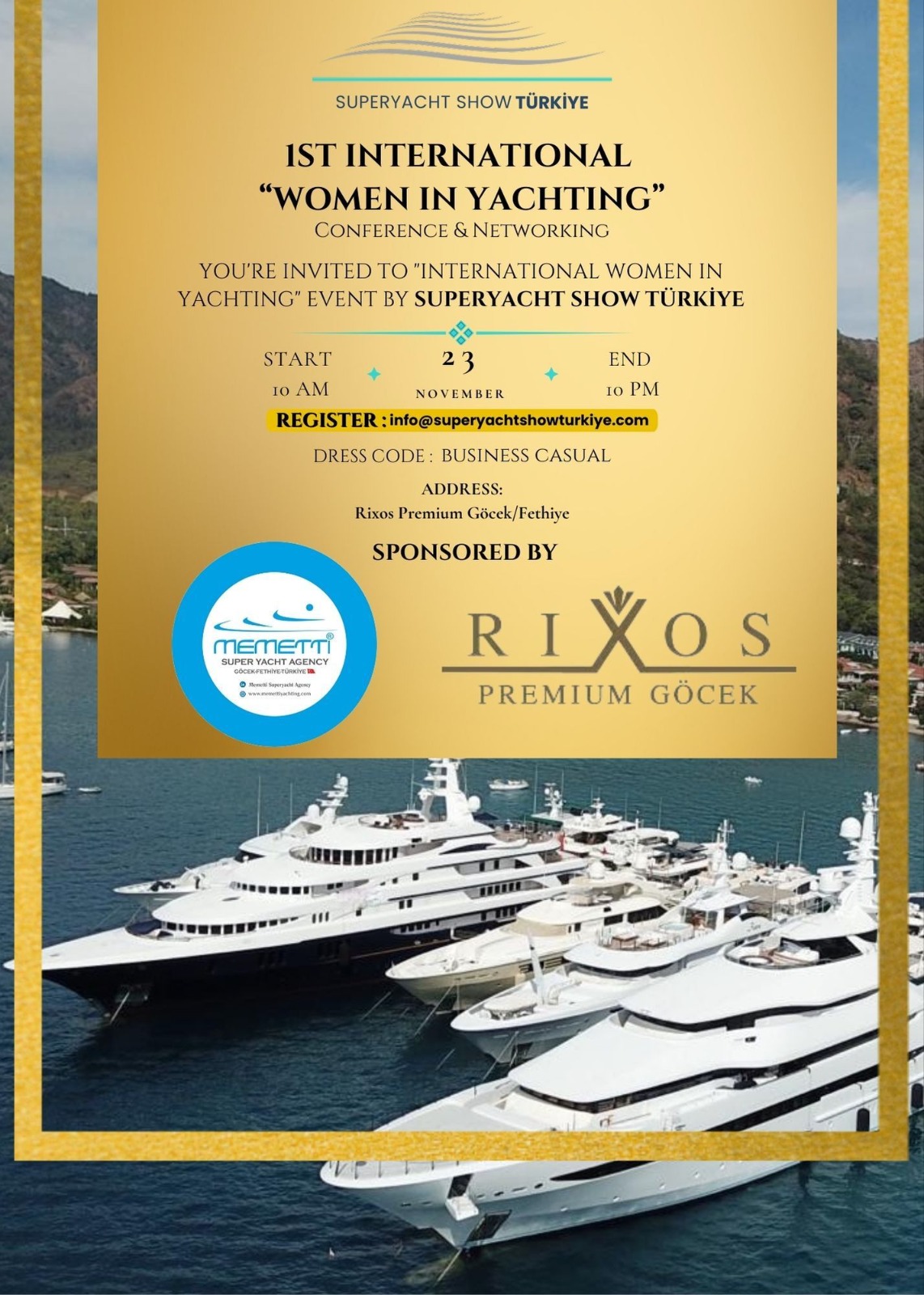 La prima Conferenza internazionale sulle donne nello yachting , di cui noi di Daily Nautica siamo media sponsor, vede come main sponsor Memetti Superyacht Agency, Mengi Yay Yachting e Rixos Premium Göcek, luogo che ospiterà il convegno.