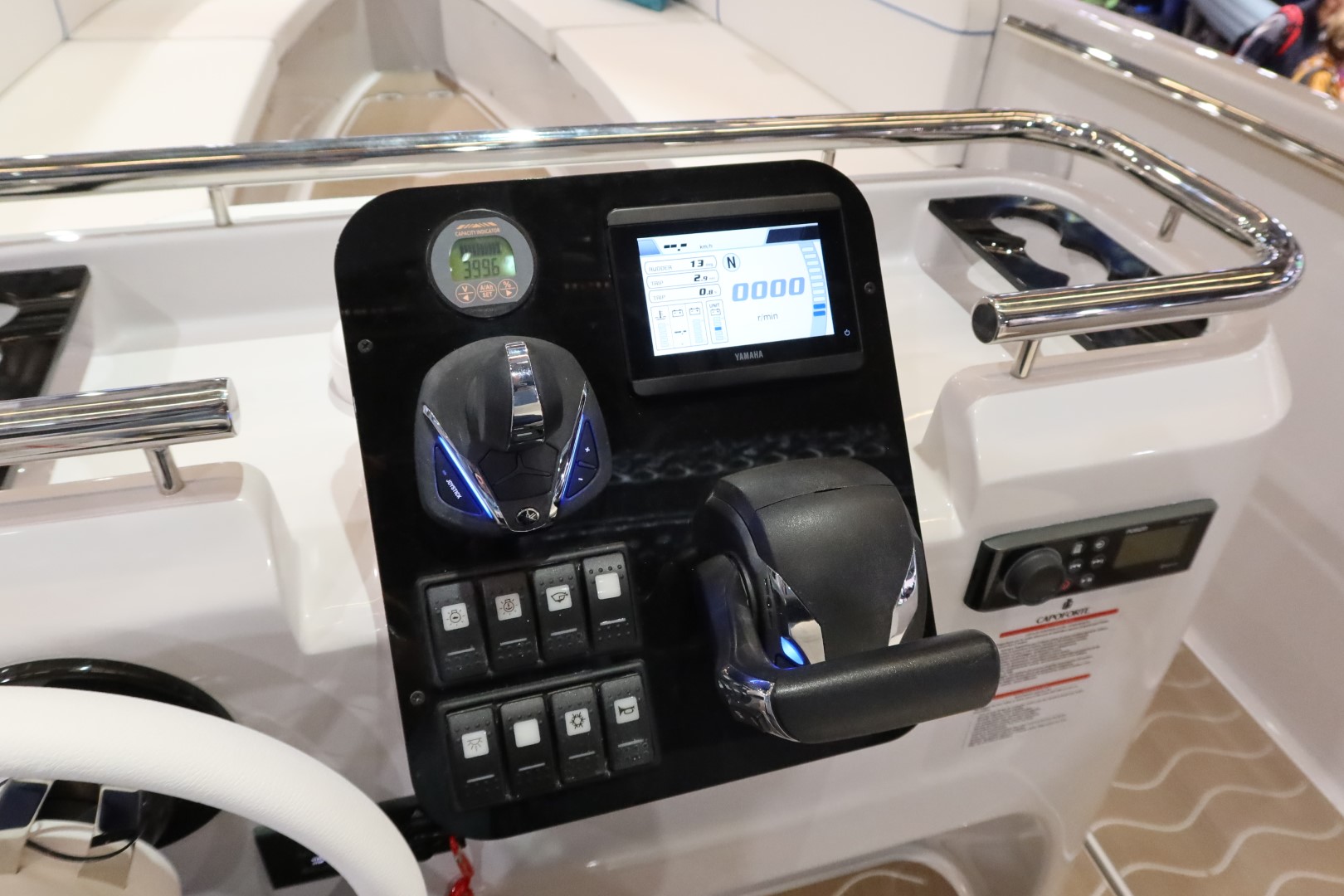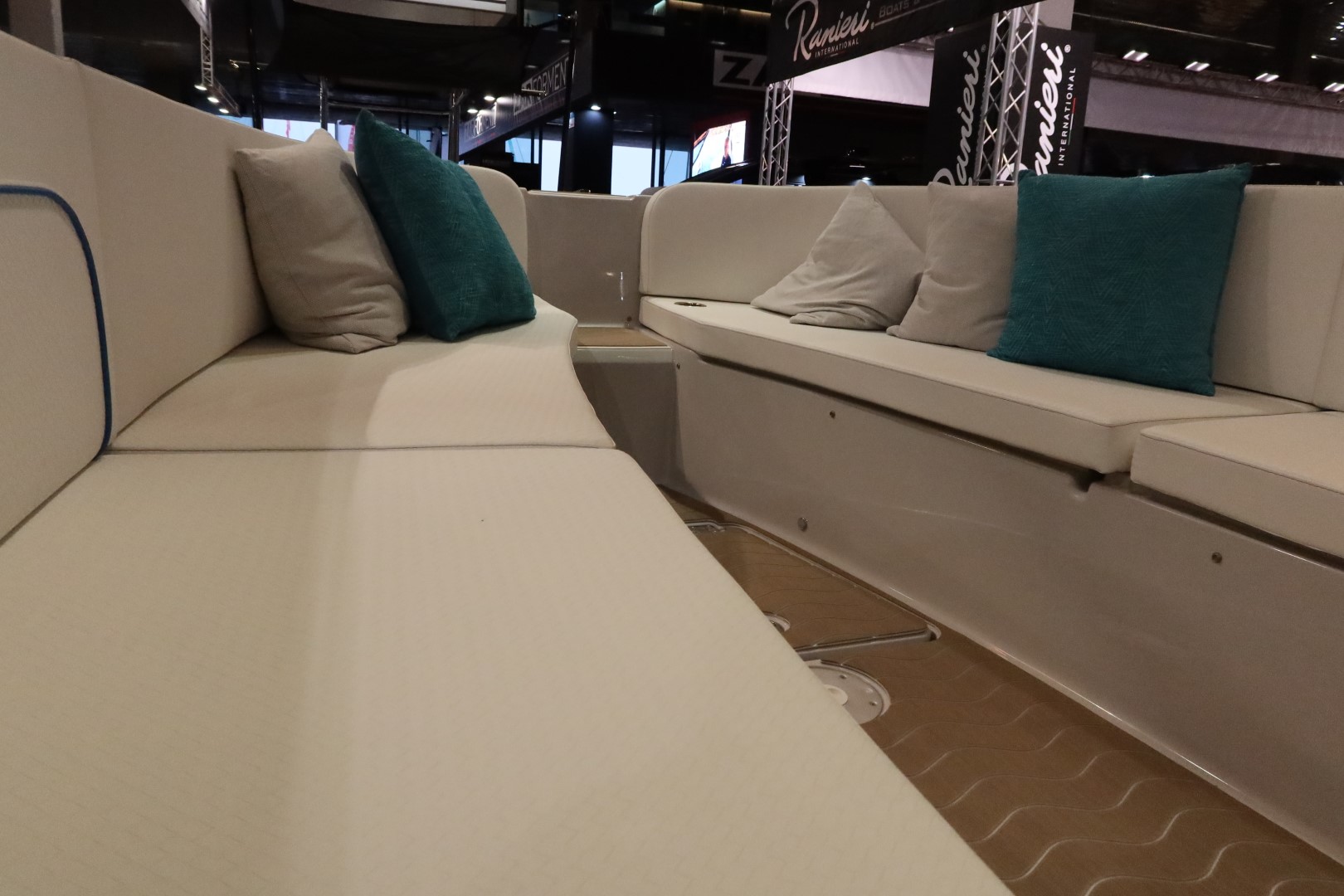 La consolle centrale consente di muoversi agevolmente in tutta sicurezza e il suo disegno richiama quello di un elemento di arredo elegante e tecnologico, evitando forme ostentatamente dinamiche. A poppa, la presenza di un grande prendisole centrale permette di godere appieno della comoda plancetta a tutta larghezza.