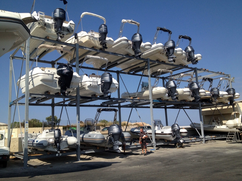 La sua caratteristica innovativa è data dall’appoggio delle barche, che a differenza di quelli attualmente in commercio che prevedono l’appoggio su due barre di legno orizzontali, la nostra struttura prevede due barre di acciaio, con l’applicazione di parabordi ad altissima resistenza che “abbracciano” la carena in sicurezza.