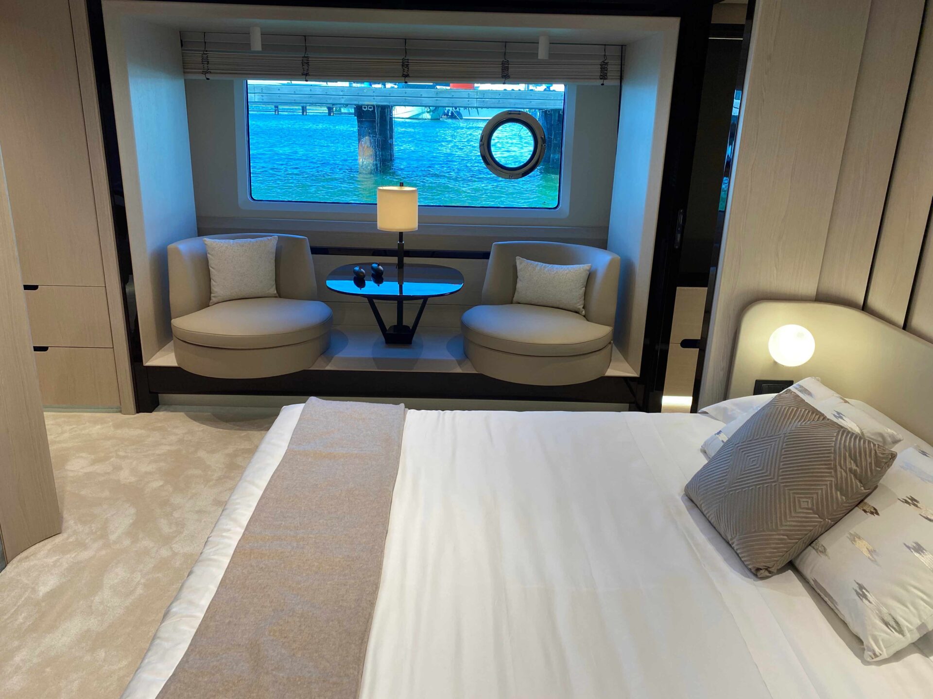 Curato in tutte le sue forme da Neo Design, in collaborazione con Azimut, presenta due cabine, una armatoriale a prua e una doppia a poppa con due letti singoli che si possono unire e diventare un letto matrimoniale. I bagni sono due, entrambi con box doccia separato. Il layout di sottocoperta nasce dalla volontà di mantenere, come nel modello precedente, dinette e cucina in posizione contrapposta.