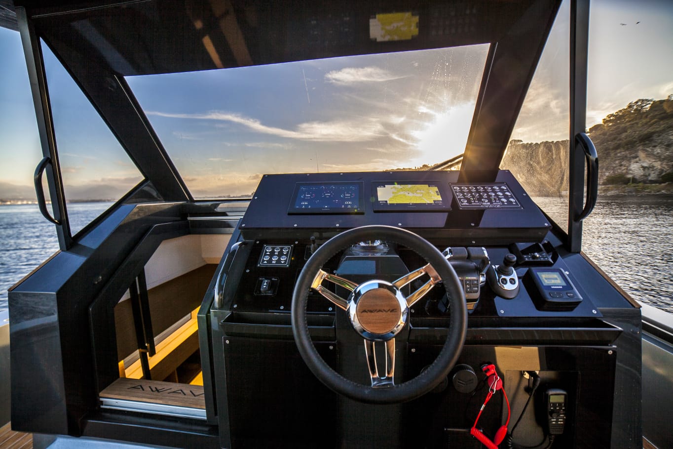 Il posto di pilotaggio offre due poltrone avvolgenti, oltre alla possibilità di ulteriori due sedute laterali, il tutto di fronte alla console a due livelli che accoglie i due touch screen multifunzionali per la navigazione e il controllo dei motori e dei liquidi, la pulsanteria, le manette di controllo dei motori e il pratico joy stick per le manovre fini in porto e l’easy docking, massima semplificazione per l’ormeggio anche in acque ristrette. La ruota del timone è in verità un elegante volante sportivo arricchito dal logo “AWAVE” che campeggia al centro di un disco di teak naturale.