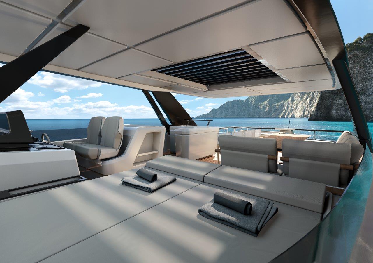Il flybridge può essere configurato con arredi freestanding che affiancano un grande mobile bar multifunzione, l’area dinette per otto persone e una jacuzzi a poppa, su richiesta. Il comfort è garantito da un hard top disponibile in tre differenti configurazioni: vetro fisso, apribile o con lamelle oscuranti. Spicca a prua un’area convertibile da zona pranzo a grande prendisole.